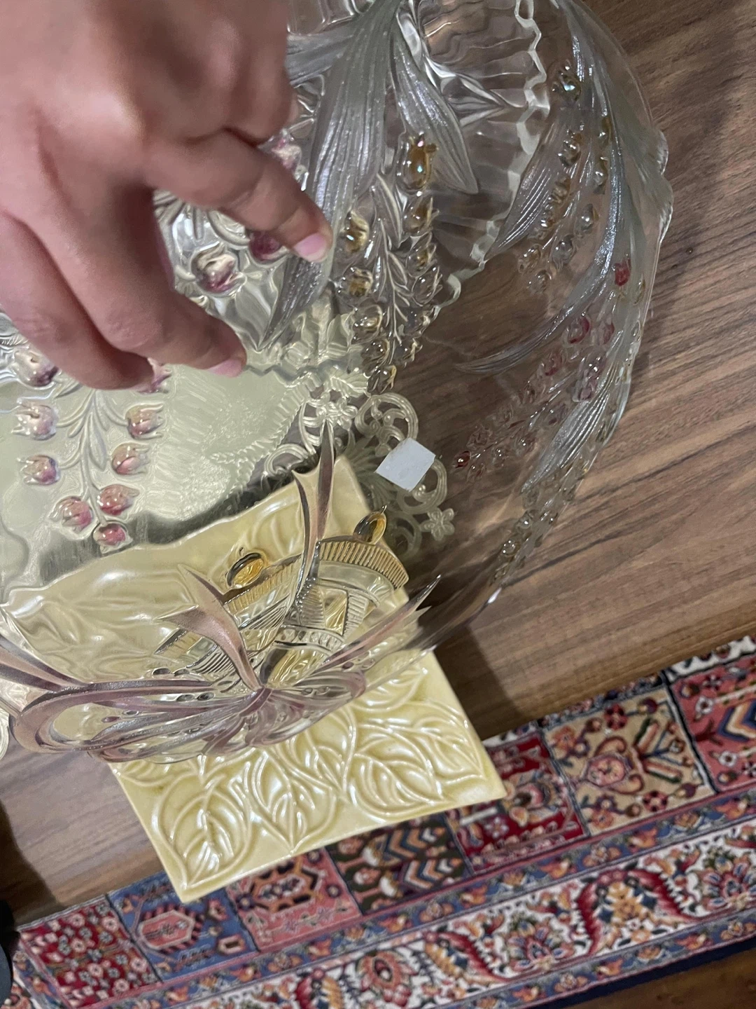 Selling a decorative glass serving platter. It has a beautiful floral design with accents of gold, silver, and pink. Would be perfect for serving snacks or displaying decor!
