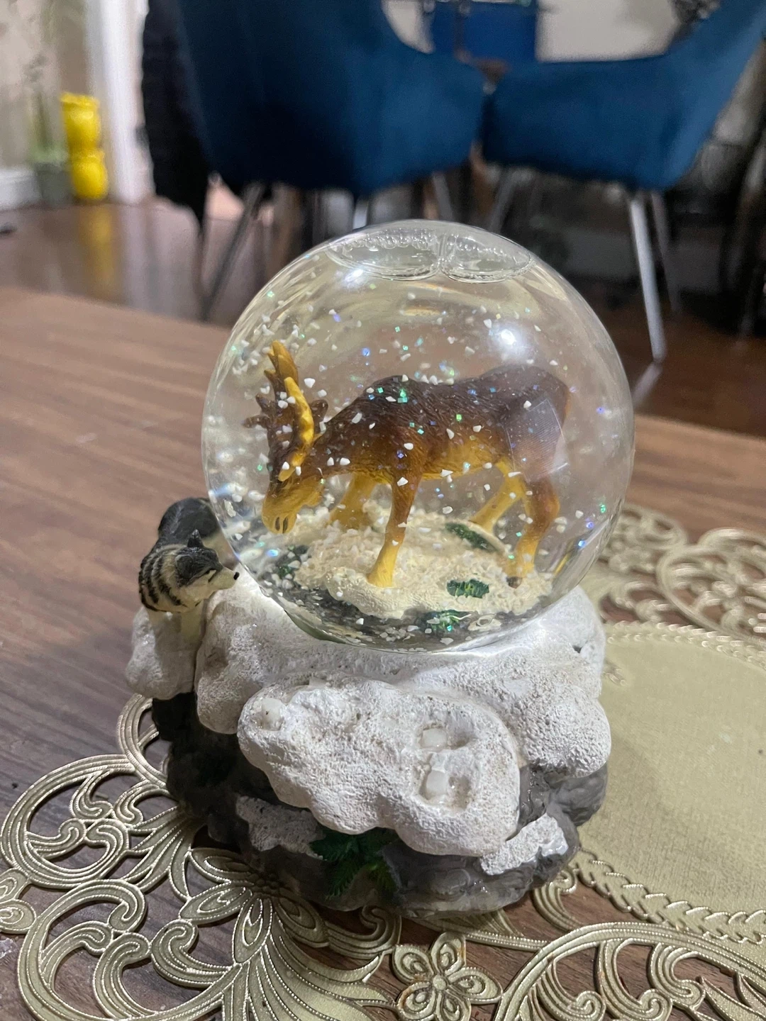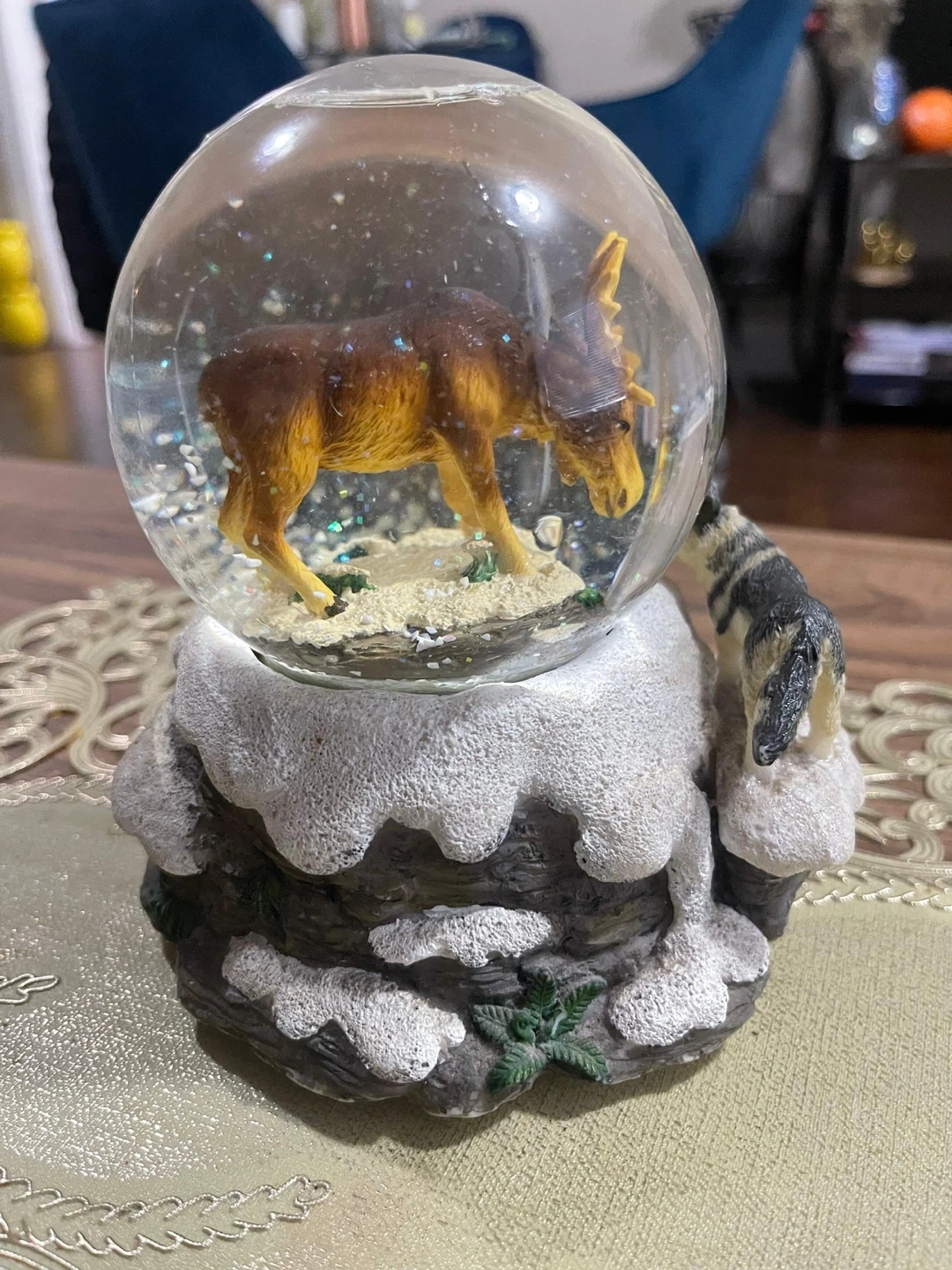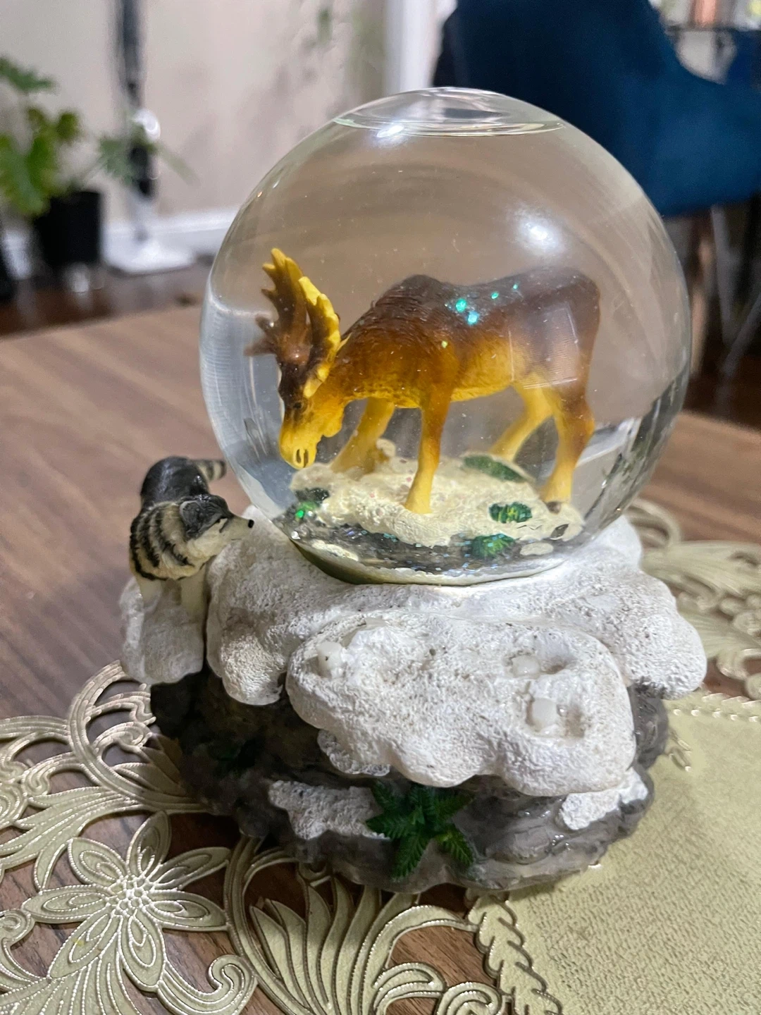 A charming snow globe featuring a moose inside and a wolf on the base! It's in great condition and would make a lovely addition to any collection or a cute decorative piece for your home