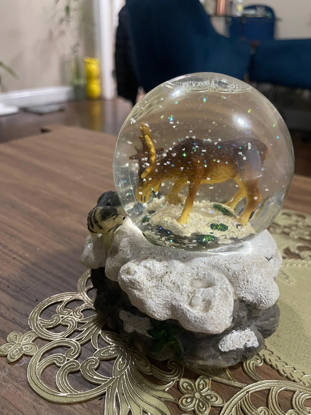 A charming snow globe featuring a moose inside and a wolf on the base! It's in great condition and would make a lovely addition to any collection or a cute decorative piece for your home