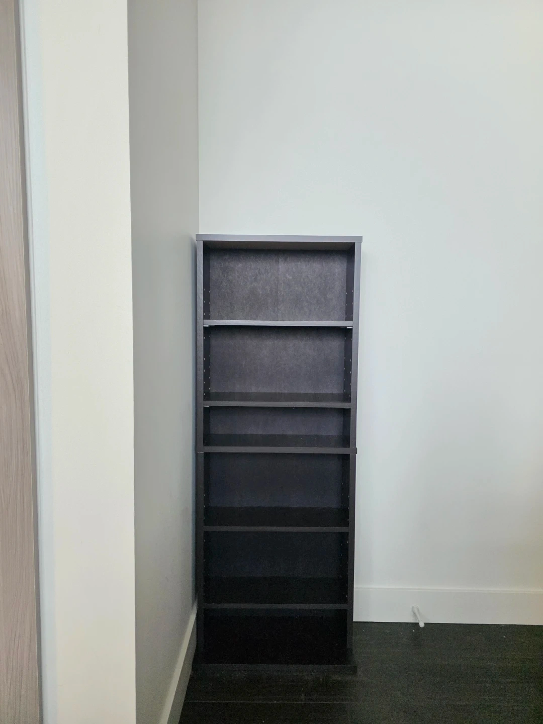 Lightly used small black bookcase for extra storage. Each shelf layer is adjustable in height.