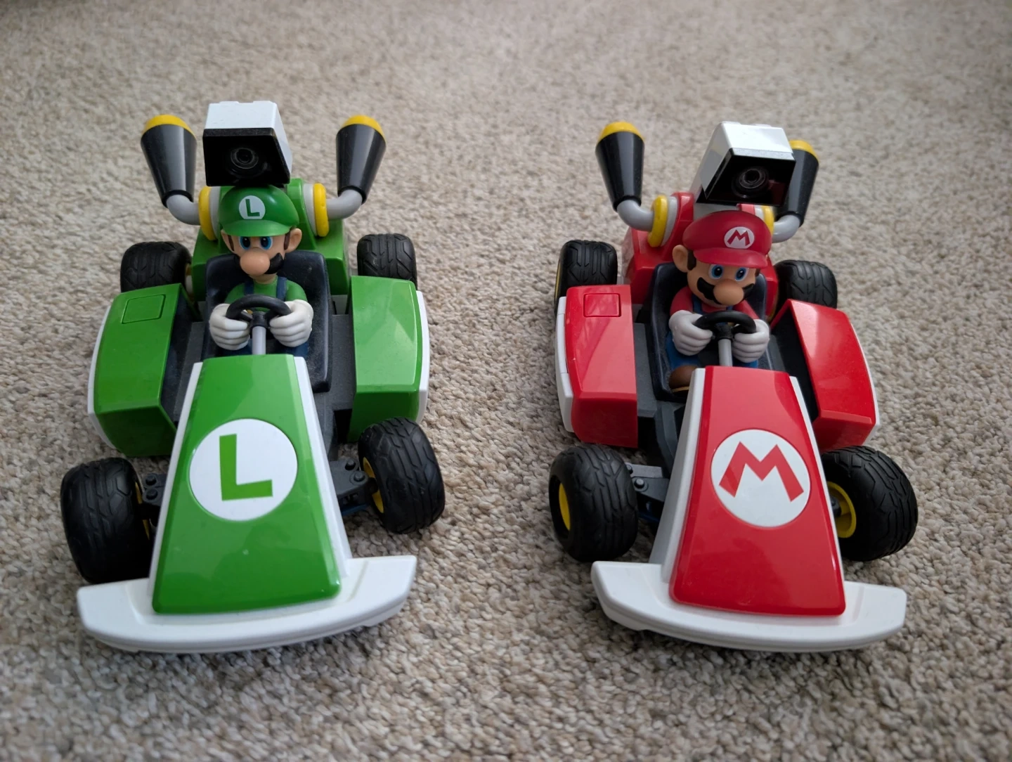 Selling a set of Mario and Luigi remote control cars with camera . They're in great condition and ready for some fun. Perfect for any little Mario Kart fan. Works with the Nintendo switch so you can watch yourself drive from the camera on the cars .