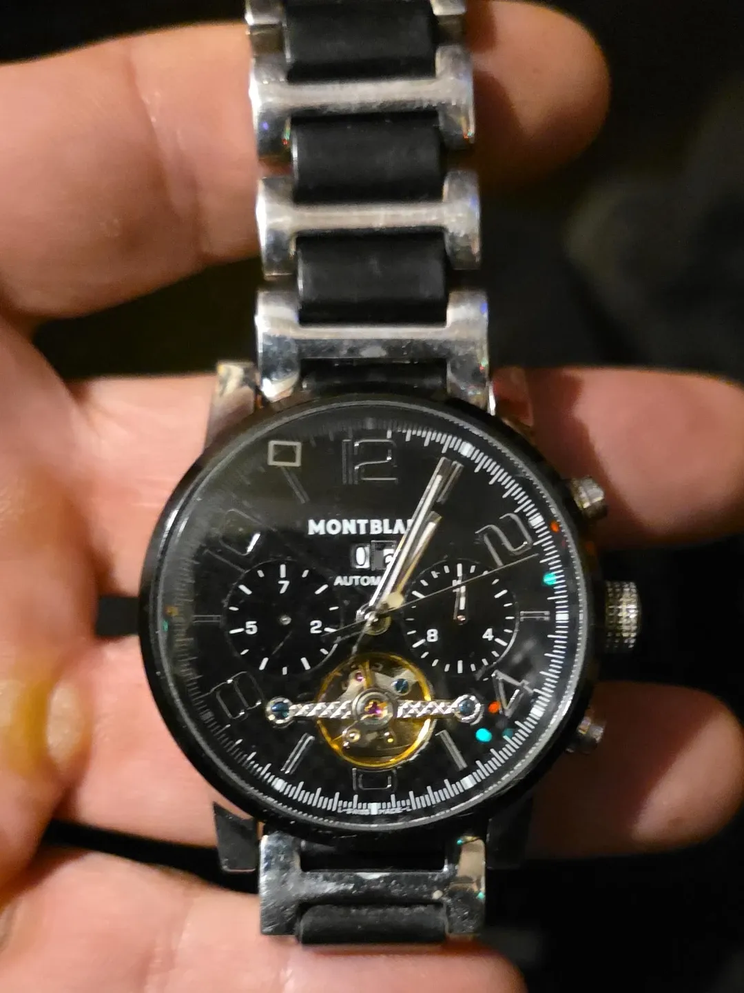 Selling a Montblanc automatic chronograph watch. It features a black face with chronograph subdials and a unique visible balance wheel. The band is a combination of silver and black links. It's in good condition and ready to wear