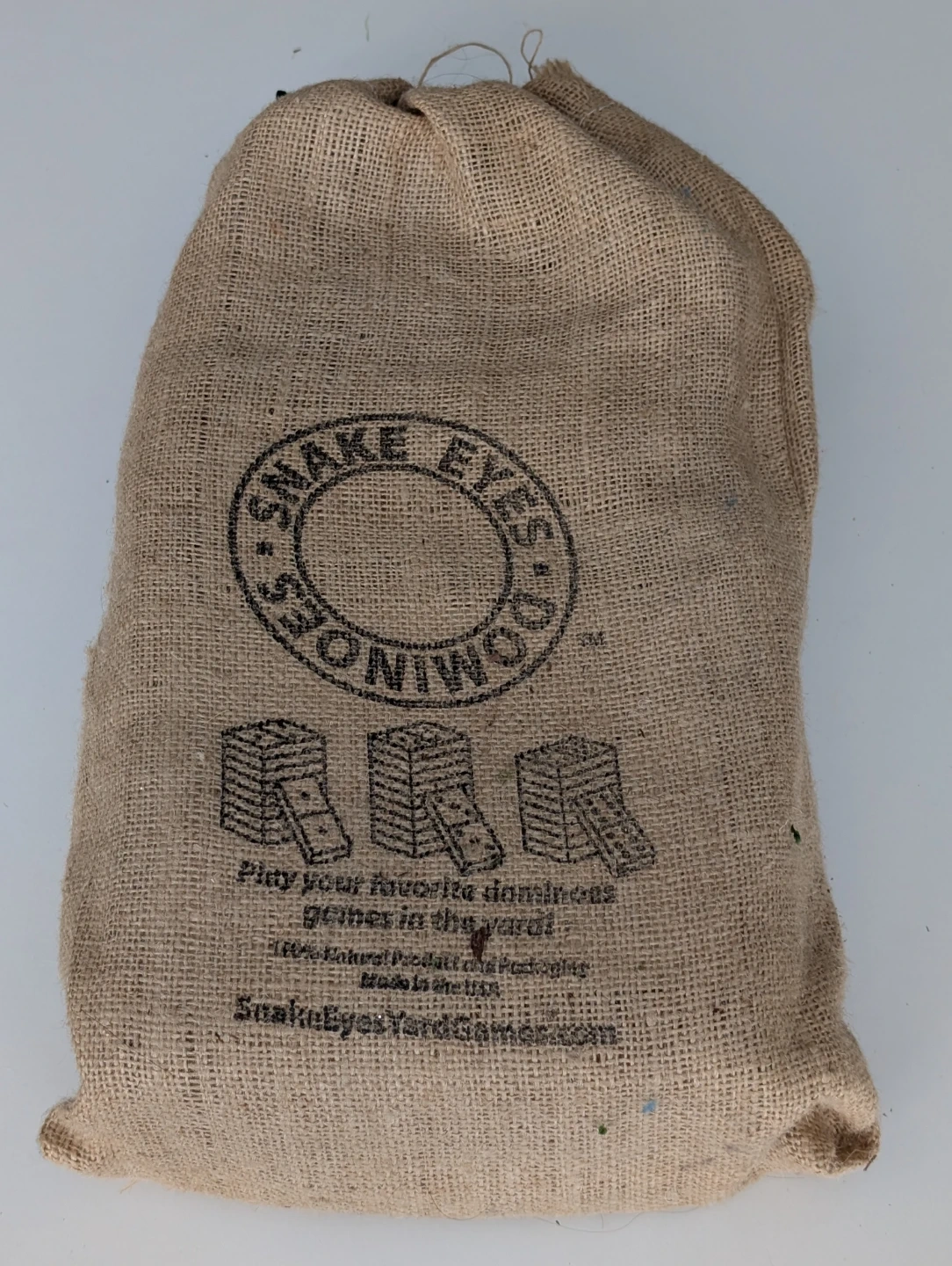 Selling a set of Snake Eyes Stonewood dominoes. These dominoes have a unique wood grain and are stored in a burlap bag. Perfect for family game night or a fun outdoor activity