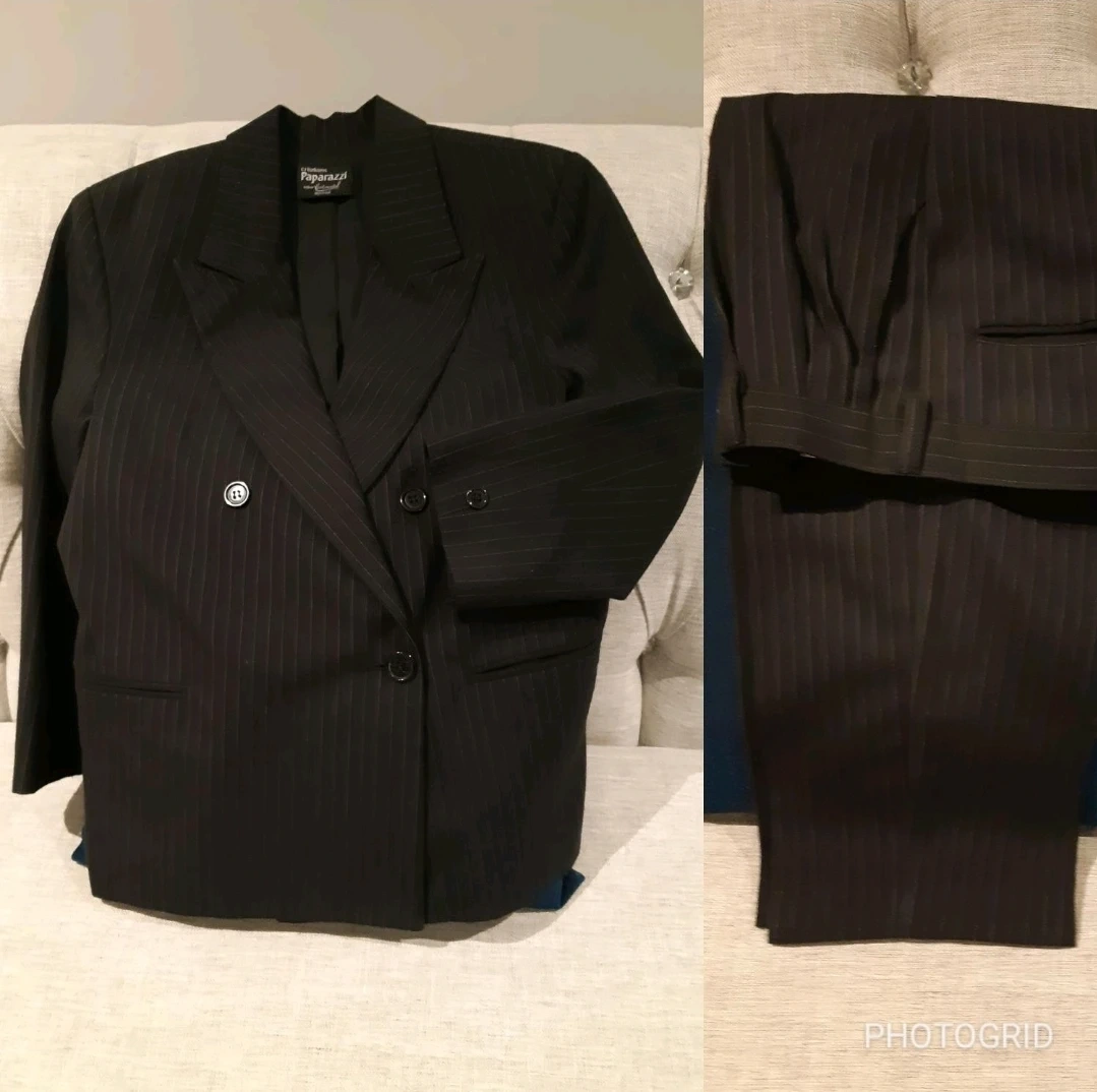 Selling a brand new black Paparazzi brand pinstripe suit. It includes both the jacket and pants. Great for formal occasions!