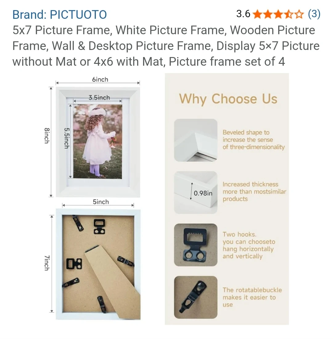 PICTUOTO 4x6 White Picture Frames (Set of 4)