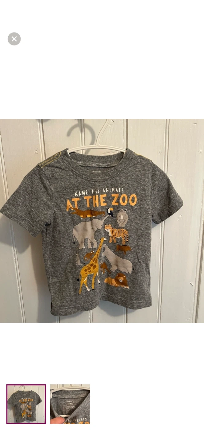 Carters brand. Short sleeve graphic T-shirt. Grey with zoo animal graphic. Size 18m. Brand new condition