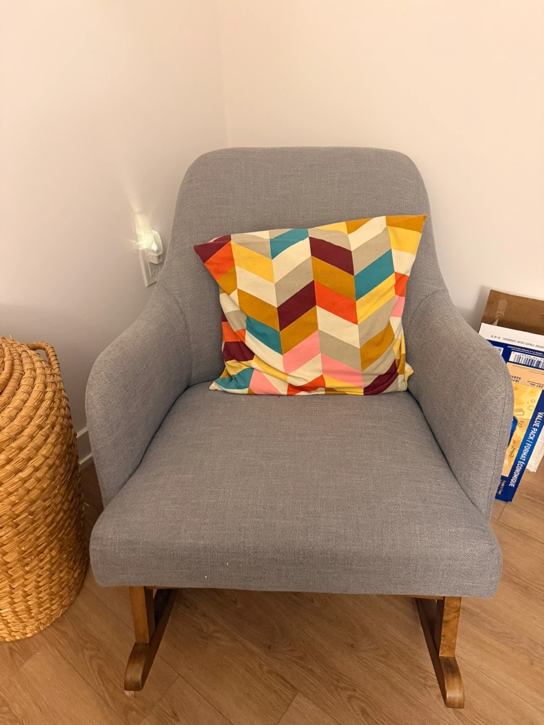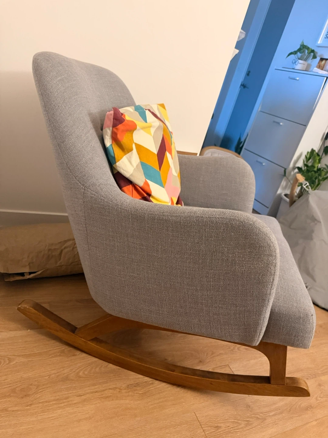 Selling a comfy grey rocking chair! It's in great condition and would be perfect for a nursery or living room.