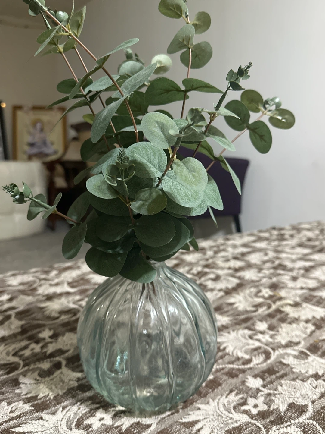 A lovely eucalyptus arrangement in a clear glass vase! It's perfect for adding a touch of greenery to any room. The vase has a ribbed design, adding a bit of texture and visual interest. It's in great condition and ready to brighten up your space