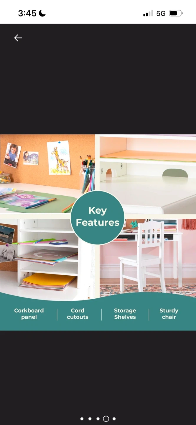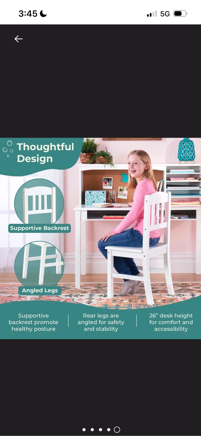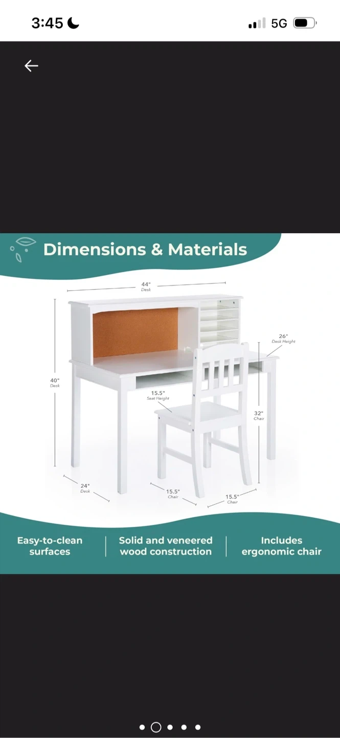 Selling a kids' media desk and chair set! This desk features ample storage with divided, built-in hutch shelves and desk cubbies, perfect for organizing books, learning supplies, and personal treasures. The desk is designed, manufactured, and tested with strict adherence to international safety and sustainability certifications. It has easy-to-clean surfaces and solid and veneered wood construction. The dimensions are 44" wide, 40" high, and 24" deep for the desk, and 26" high and 32" high for the chair. Includes an ergonomic chair
