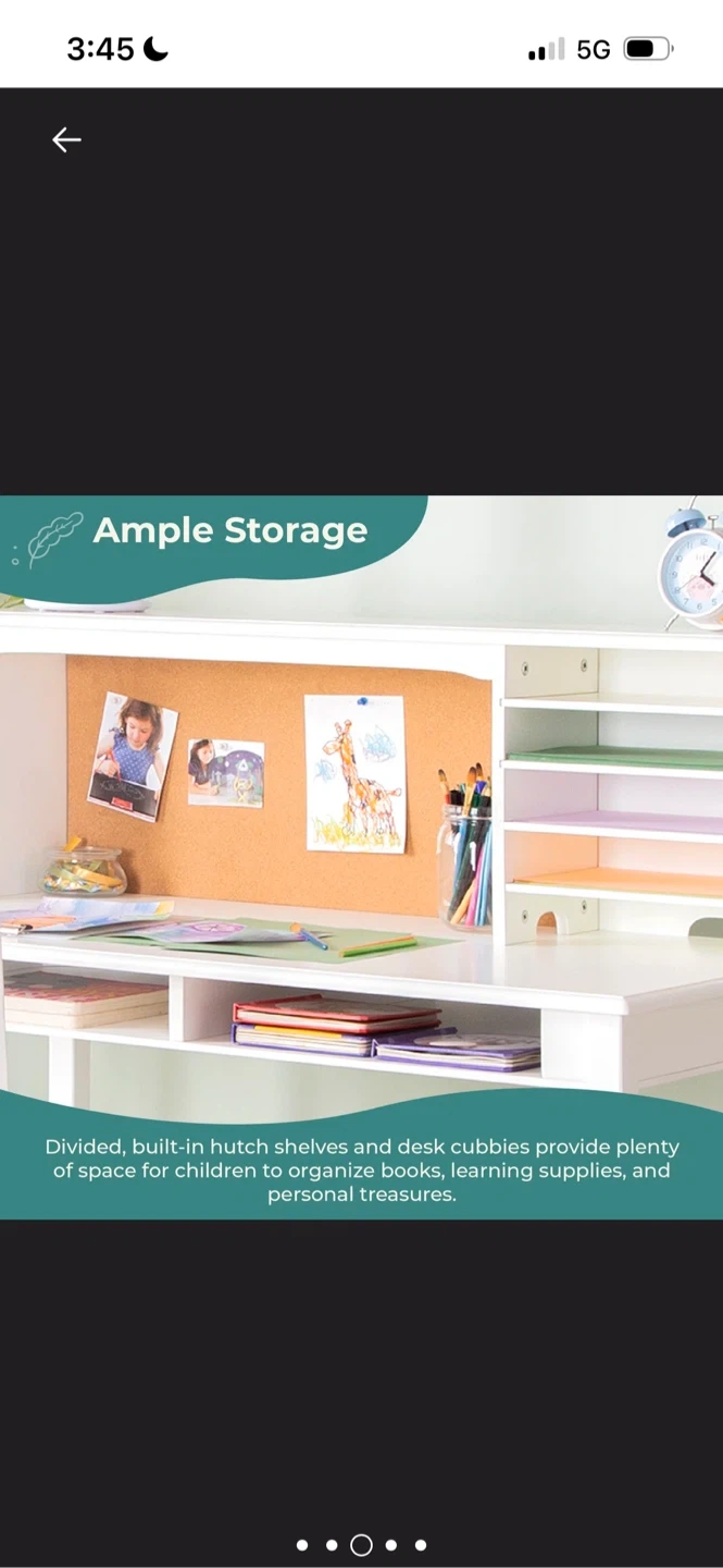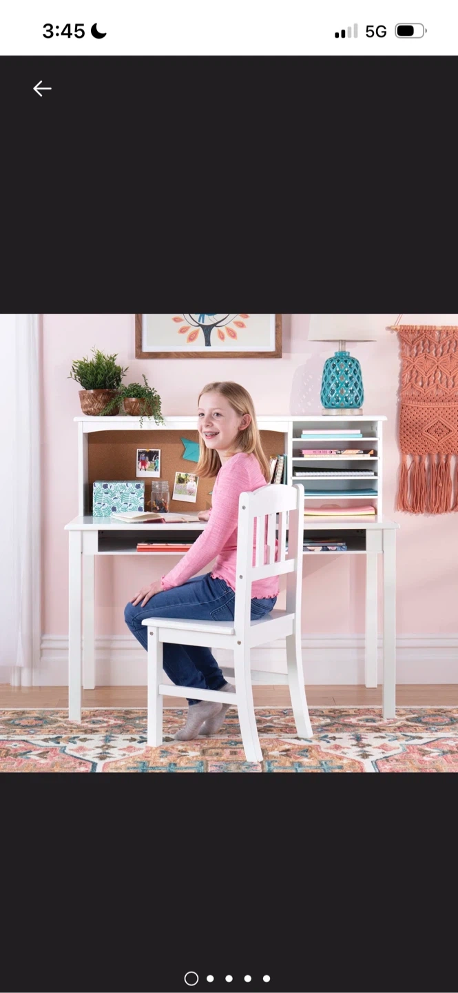 Selling a kids' media desk and chair set! This desk features ample storage with divided, built-in hutch shelves and desk cubbies, perfect for organizing books, learning supplies, and personal treasures. The desk is designed, manufactured, and tested with strict adherence to international safety and sustainability certifications. It has easy-to-clean surfaces and solid and veneered wood construction. The dimensions are 44" wide, 40" high, and 24" deep for the desk, and 26" high and 32" high for the chair. Includes an ergonomic chair