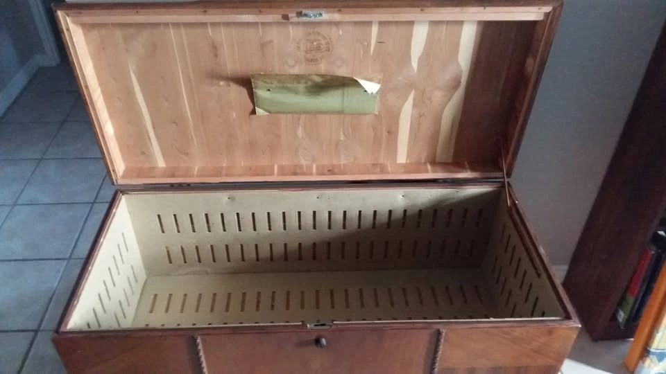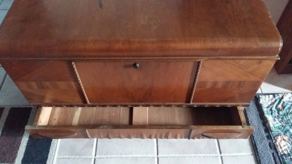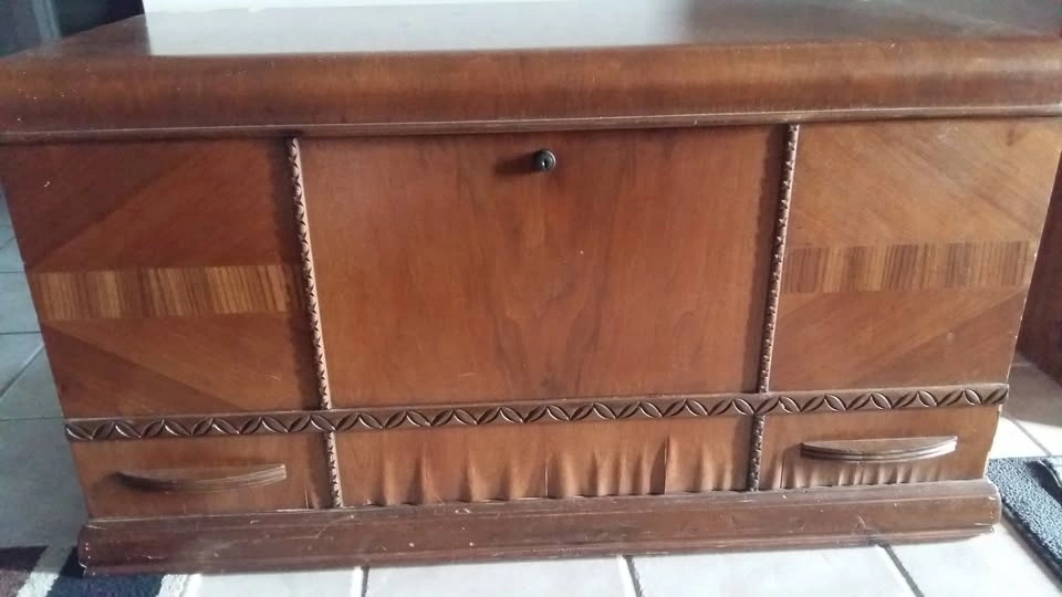 Red Seal Honderich Cedar Chest. Inside is in great condition. Lid has chips and places where veneer is missing. Bottom near drawer has some water damage. Inside is very nice. Fits blankets and linens nicely. Dimensions: 23x40.5x19"