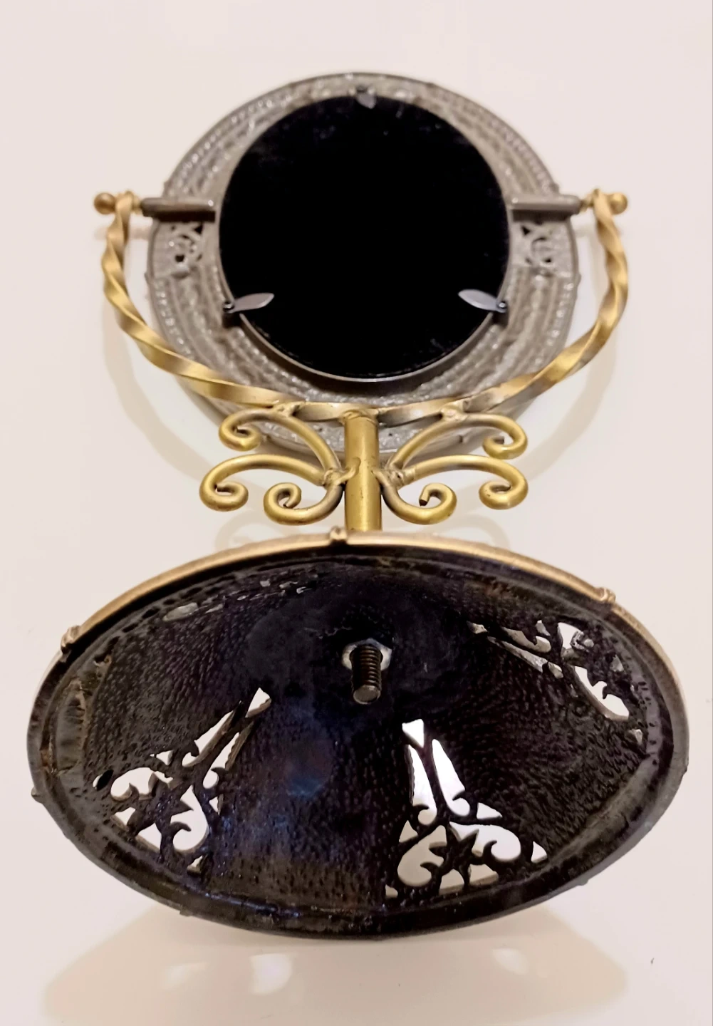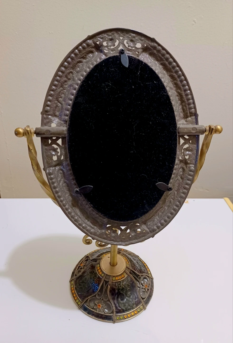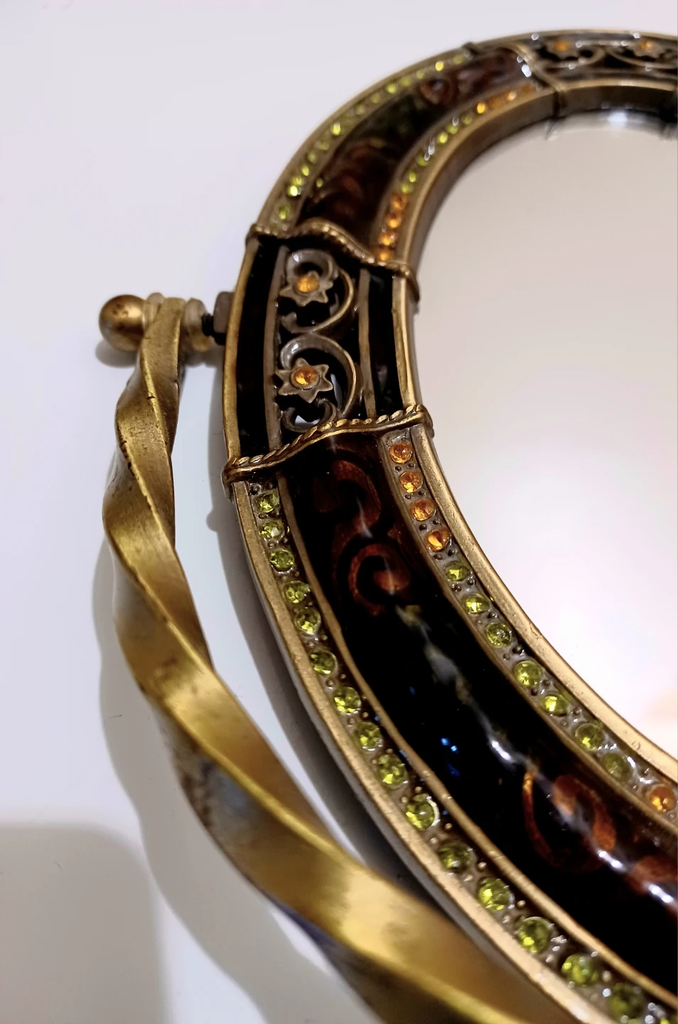 Add a touch of antique elegance to your dressing table with this ornate vanity mirror. This piece features a lovely oval mirror framed with detailed metalwork and decorative jewel accents. The base is equally stunning, showcasing intricate patterns and colours. This mirror remains in excellent condition, perfect for adding character to any room. A great addition to any collection, the mirror provides both function and vintage charm.