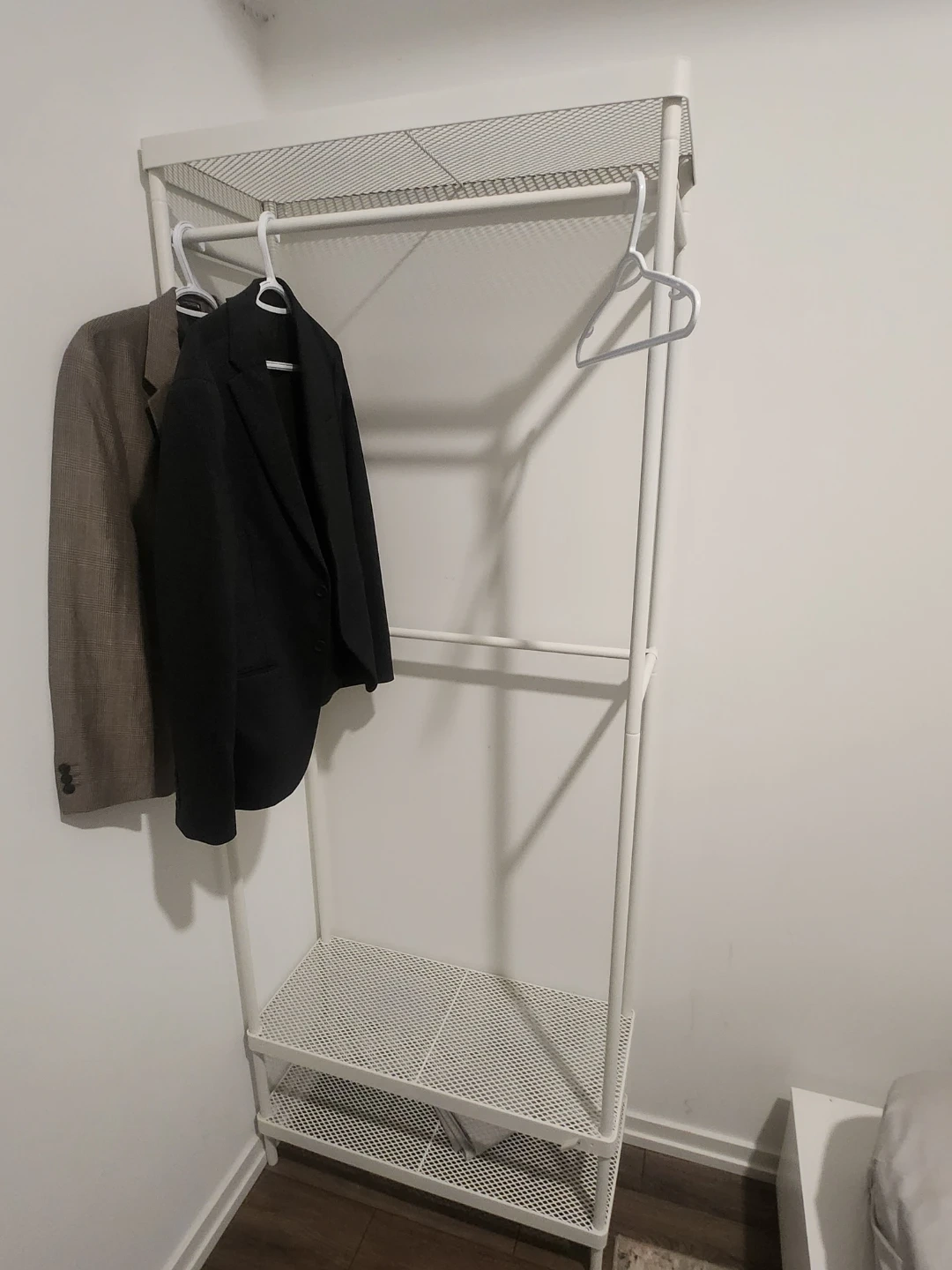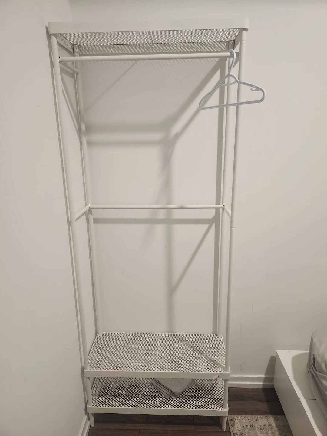Selling a white IKEA clothes rack! It's in great condition and perfect for adding some extra storage to your space. It features a top shelf, a hanging bar, and two wire shelves at the bottom. Ready for pick up!