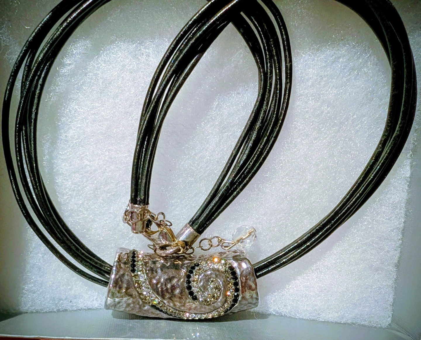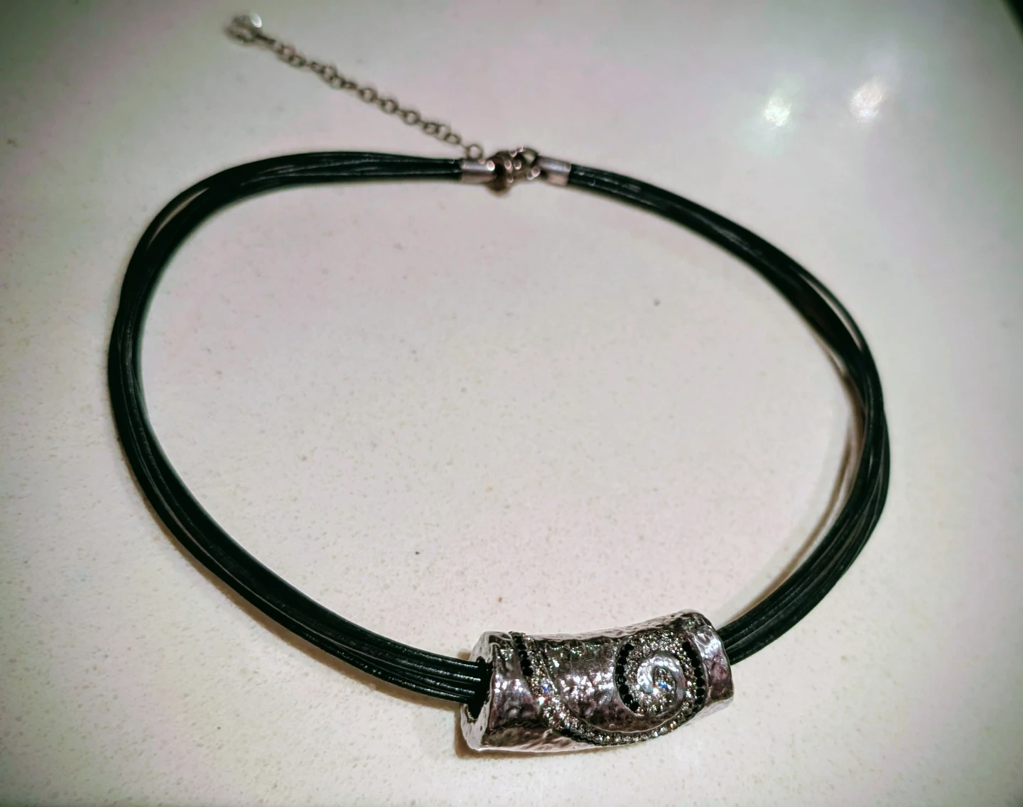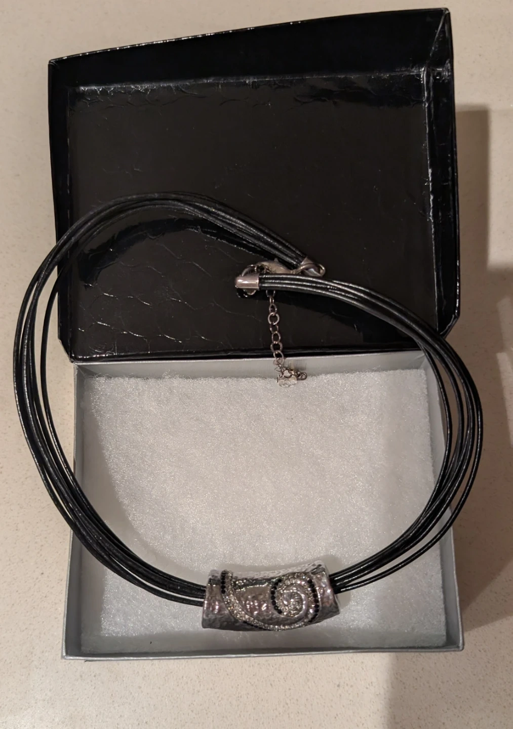 Selling a beautiful sterling silver choker necklace! It's marked with '925' indicating the silver purity. The necklace features a unique design with a decorative silver centerpiece and multiple black cords. Comes with its original box!