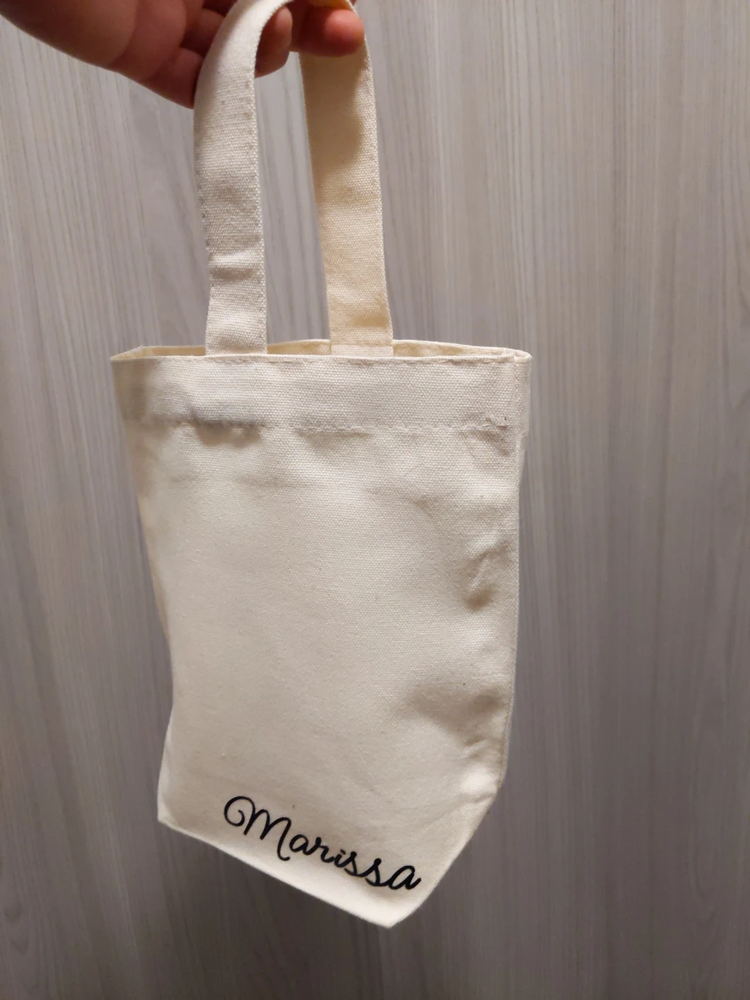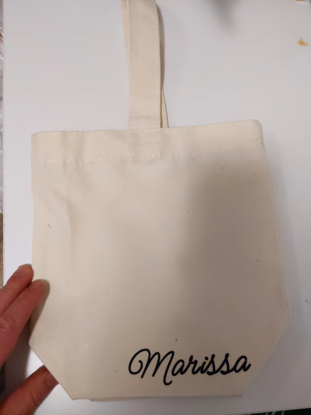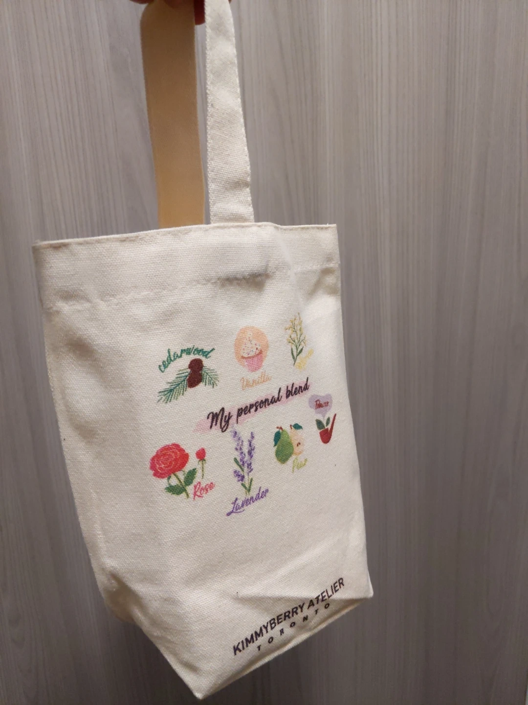 Here's a cute tote bag from Kimmyberry Atelier in Toronto! It features a unique design with different scents like cedarwood, vanilla, rose, and lavender. It also has the name "Marissa" on the back. Perfect for carrying your essentials around town