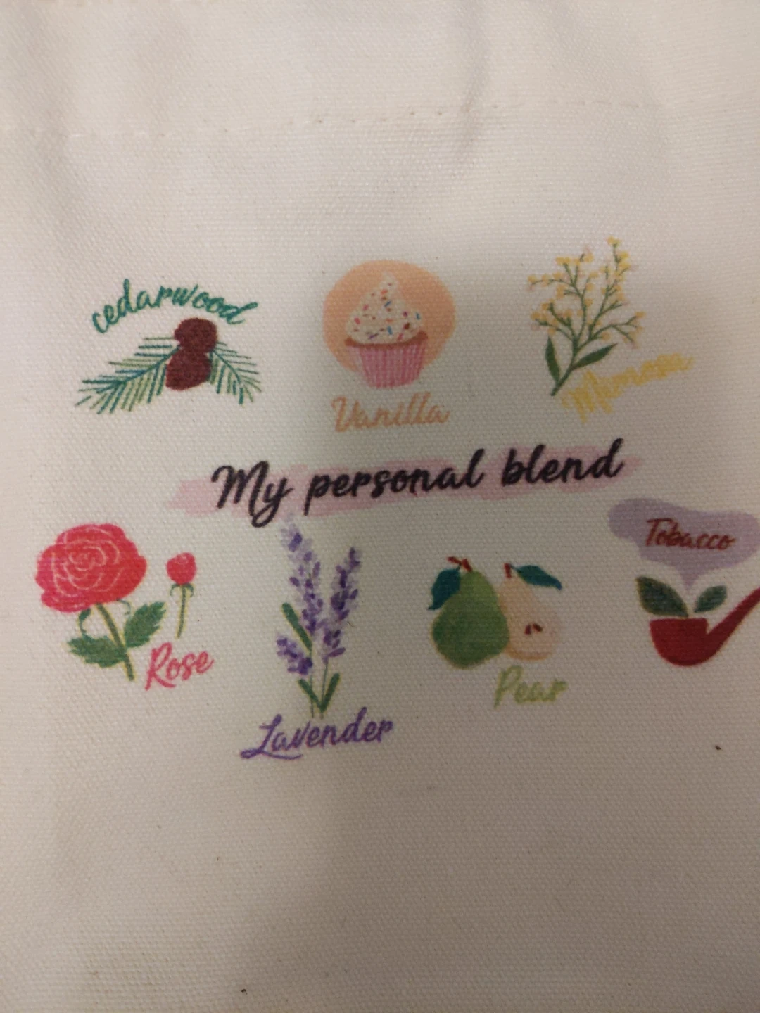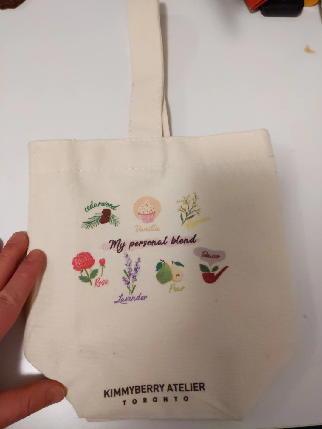 Here's a cute tote bag from Kimmyberry Atelier in Toronto! It features a unique design with different scents like cedarwood, vanilla, rose, and lavender. It also has the name "Marissa" on the back. Perfect for carrying your essentials around town