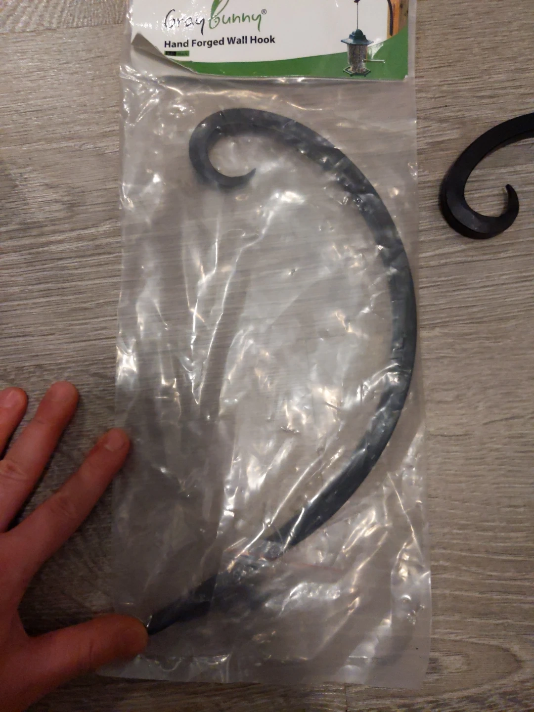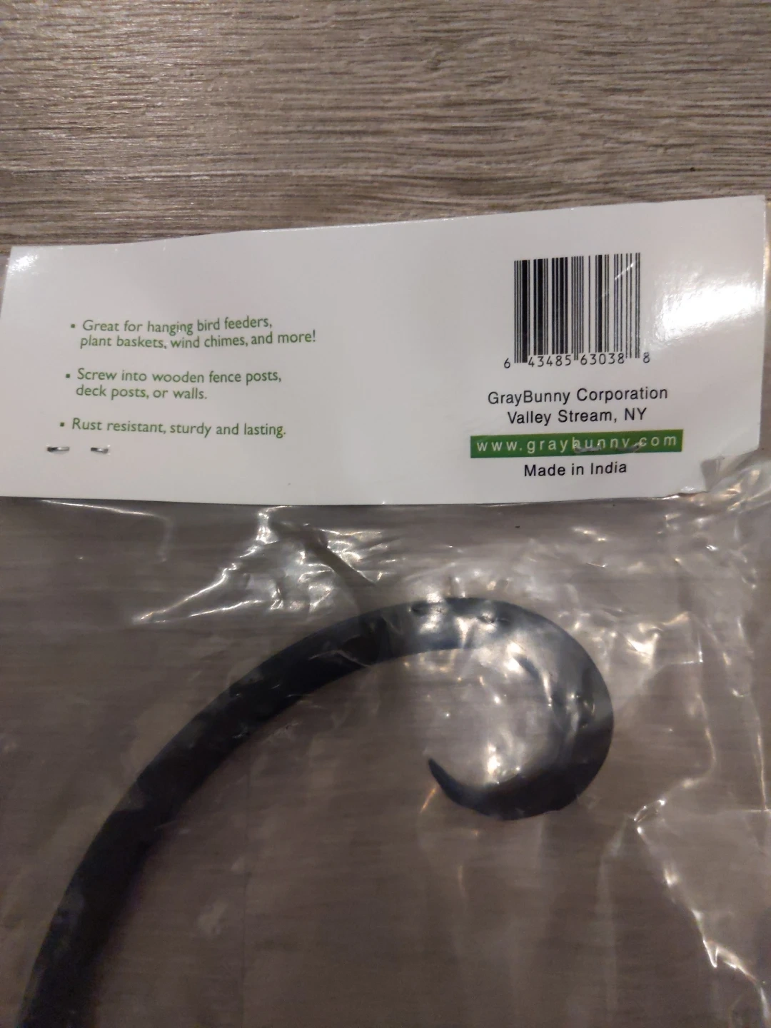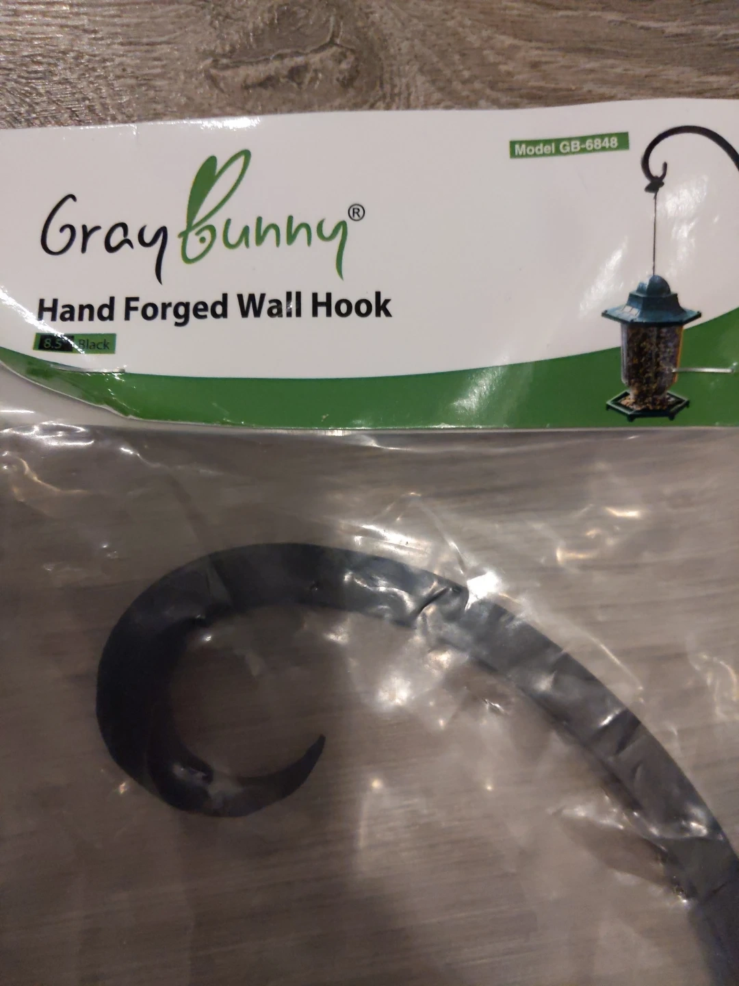 Here's a GrayBunny hand forged wall hook, model GB-6848! It's black and looks great for hanging bird feeders, plant baskets, wind chimes, and more. It's rust resistant, sturdy and lasting, and can be screwed into wooden fence posts, deck posts, or walls
