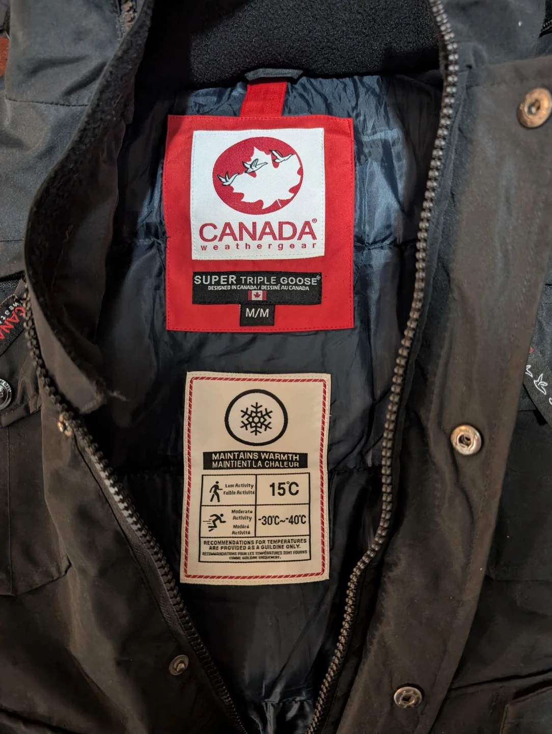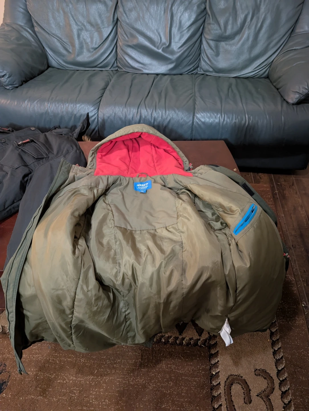 Selling a Canada Weather Gear puffer jacket in size medium and a unisex Adidas medium size. It's a Super Triple Goose design, perfect for keeping you warm in the cold weather. It's recommended for temperatures between -30°C to -40°C