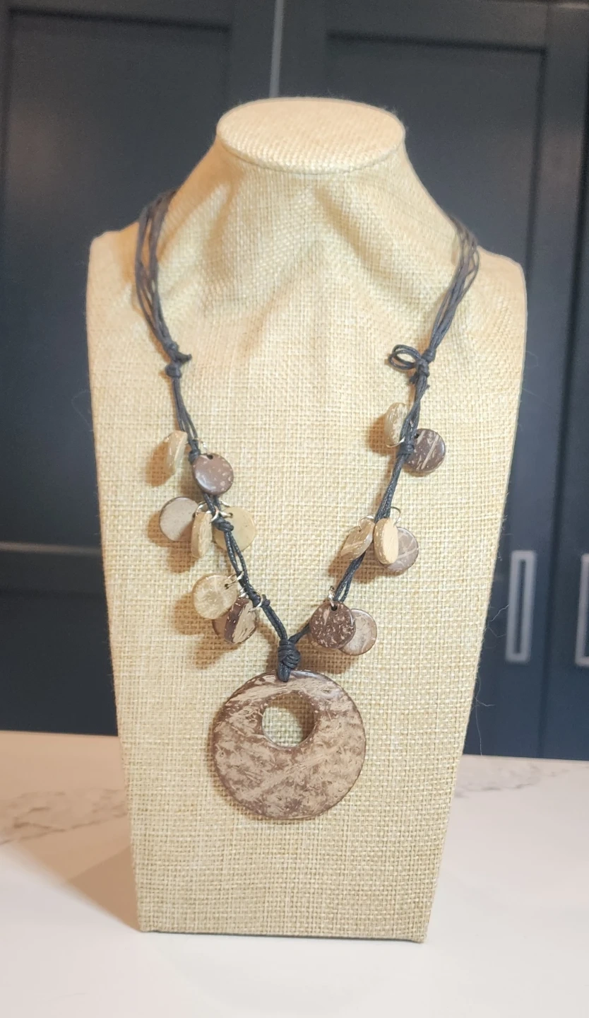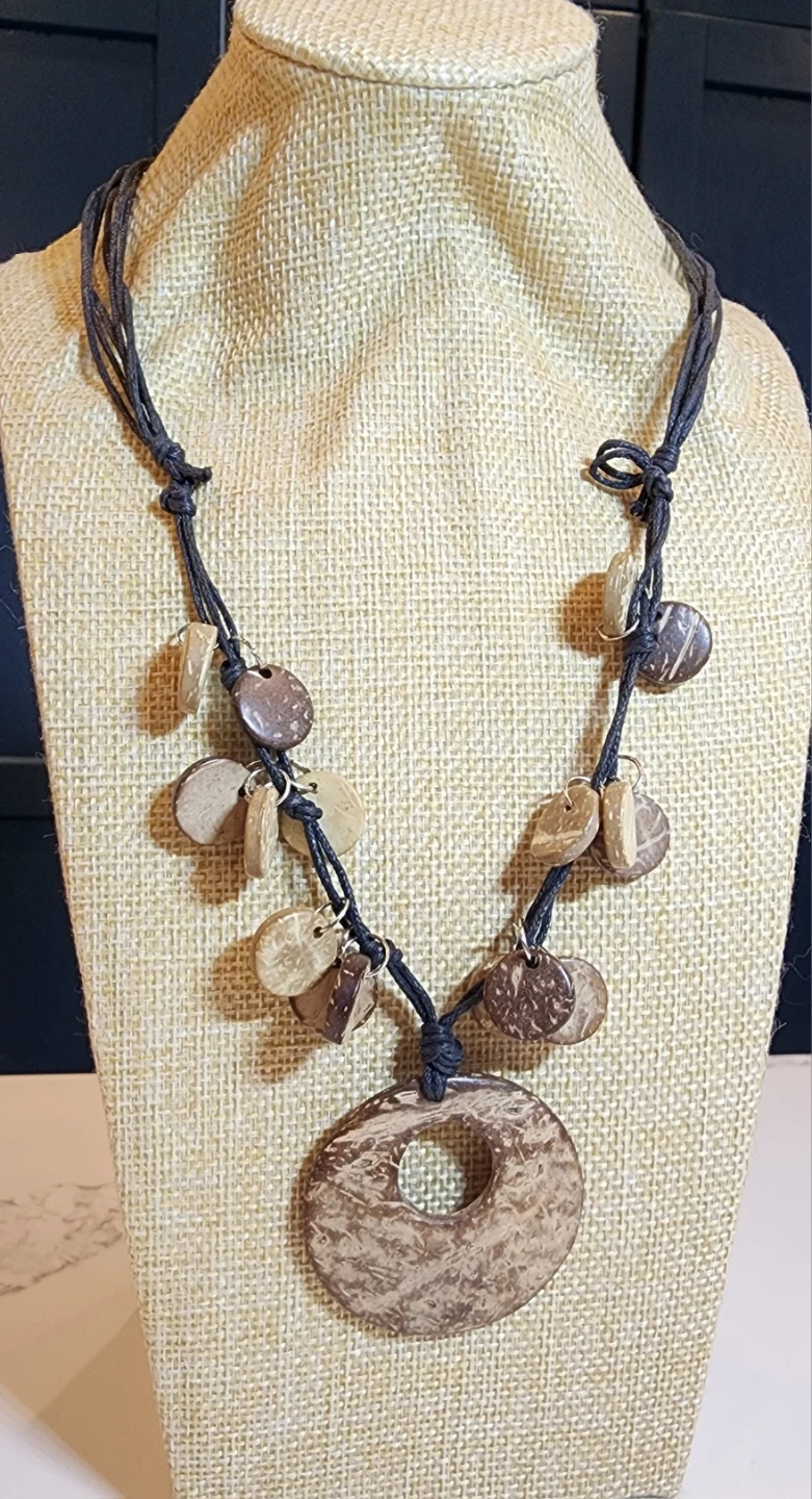 This is a unique boho style necklace made with coconut shell pieces and a dark cord. It's perfect for adding a natural and earthy touch to any outfit! The necklace is in great condition and ready to be worn.