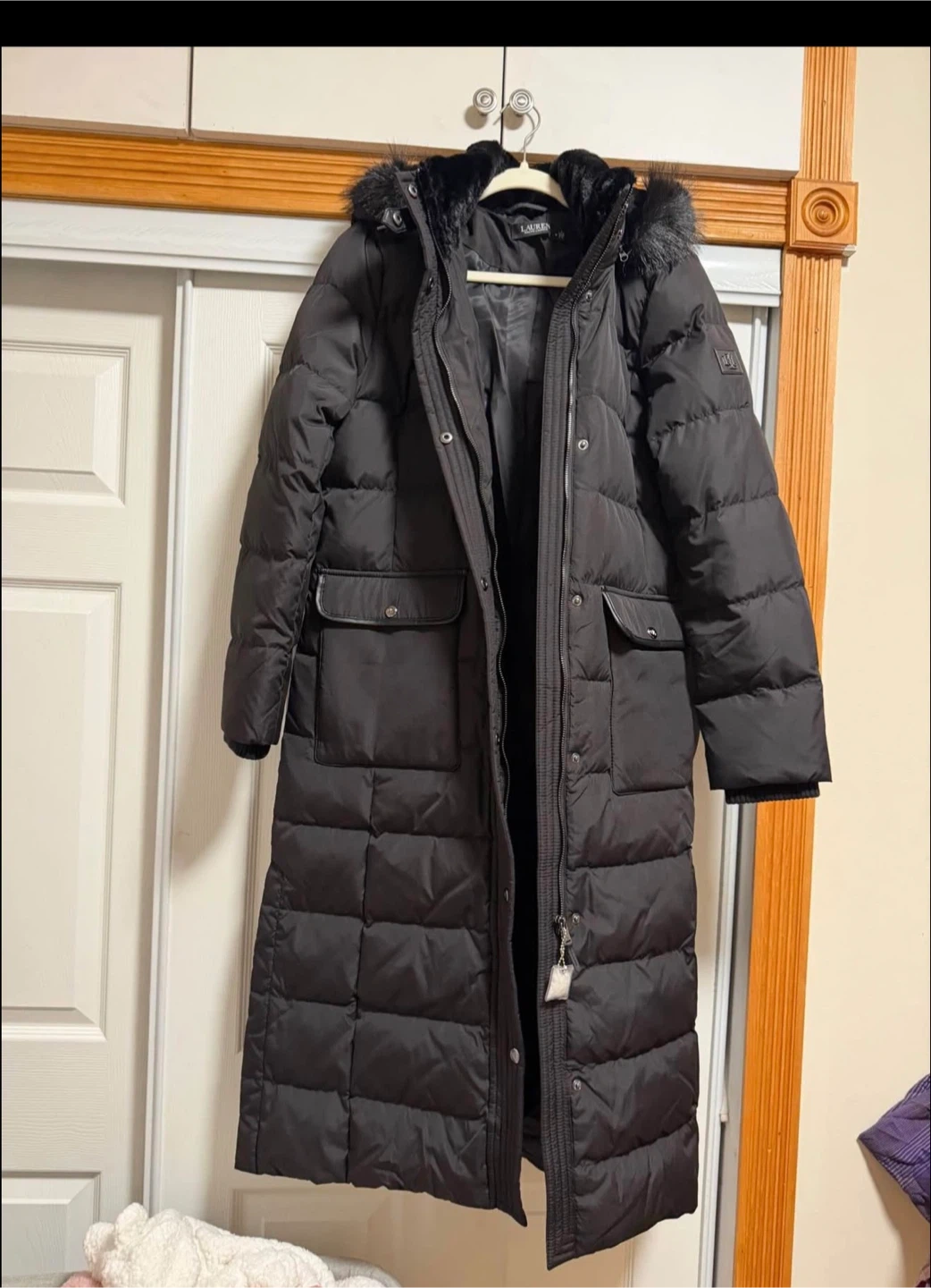 Selling a stylish black down puffer coat from Ralph Lauren! It's a full-length coat, perfect for staying warm during the colder months. It has a fur-trimmed hood and several pockets.
