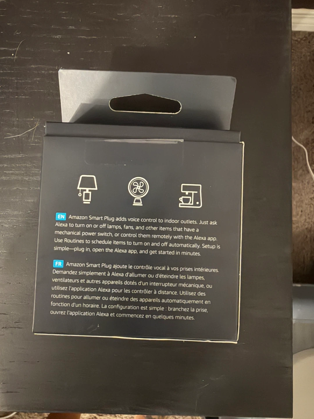 Amazon smart plug. It adds voice control to indoor outlets. Just ask Alexa to turn on or off lamps, fans, and other items that have a mechanical power switch or control them remotely with the Alexa app. Setup is simple.