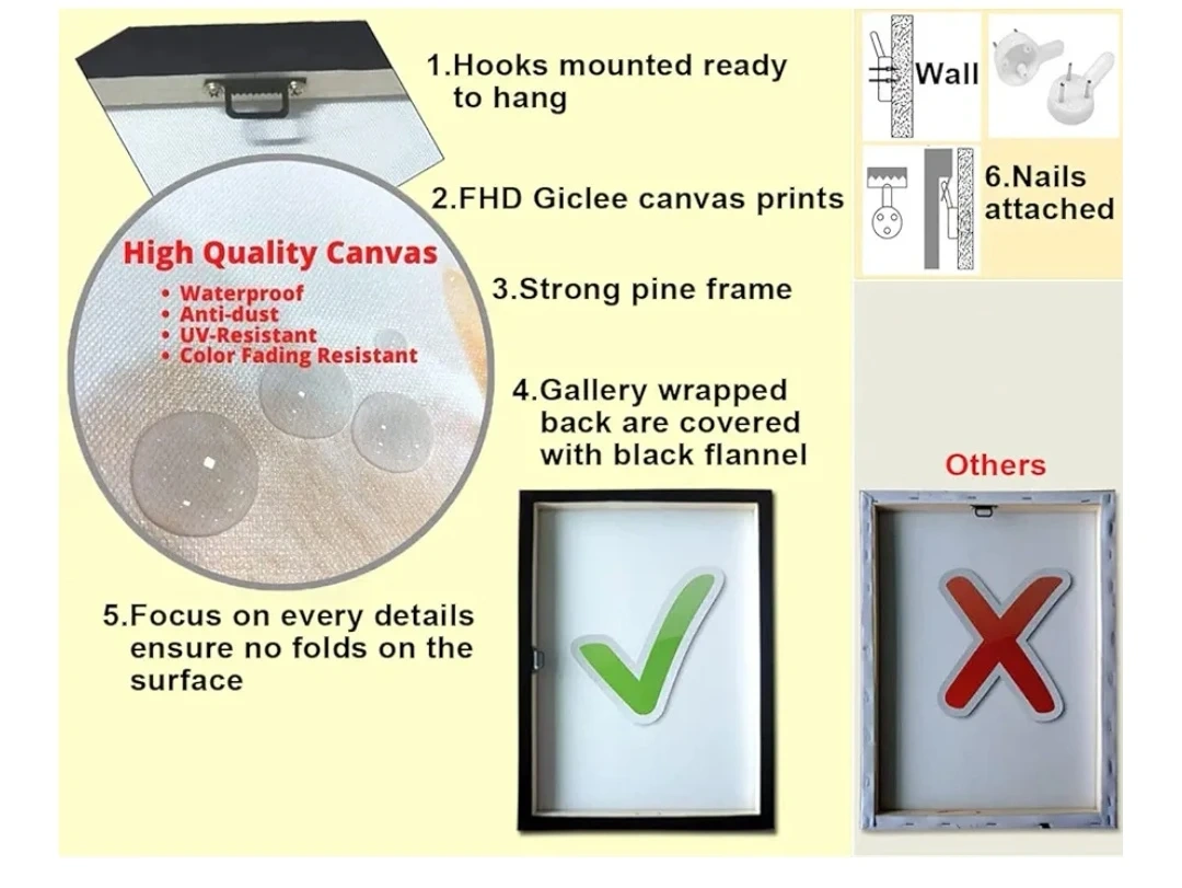 * FHD Giclee Canvas Prints: More colours and details can be seen than usual, non-fading, no smell compare with hand painted oil painting