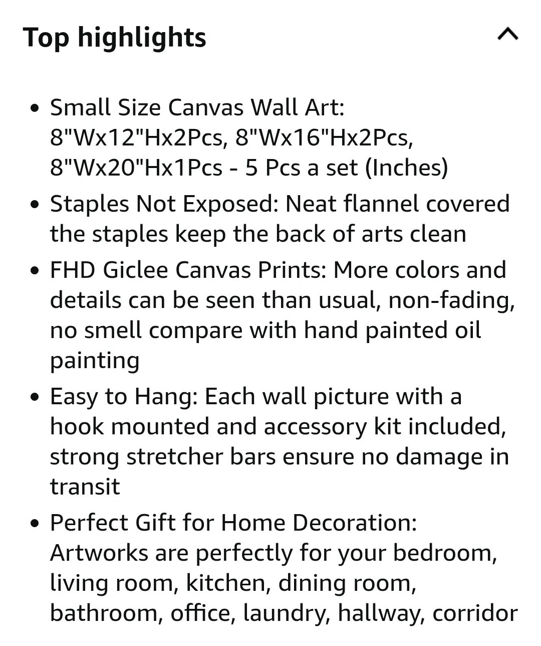 * Small Size Canvas Wall Art: 8"Wx12"Hx2Pcs, 8"Wx16"Hx2Pcs, 8"Wx20"Hx1Pcs - 5 Pcs a set (Inches)