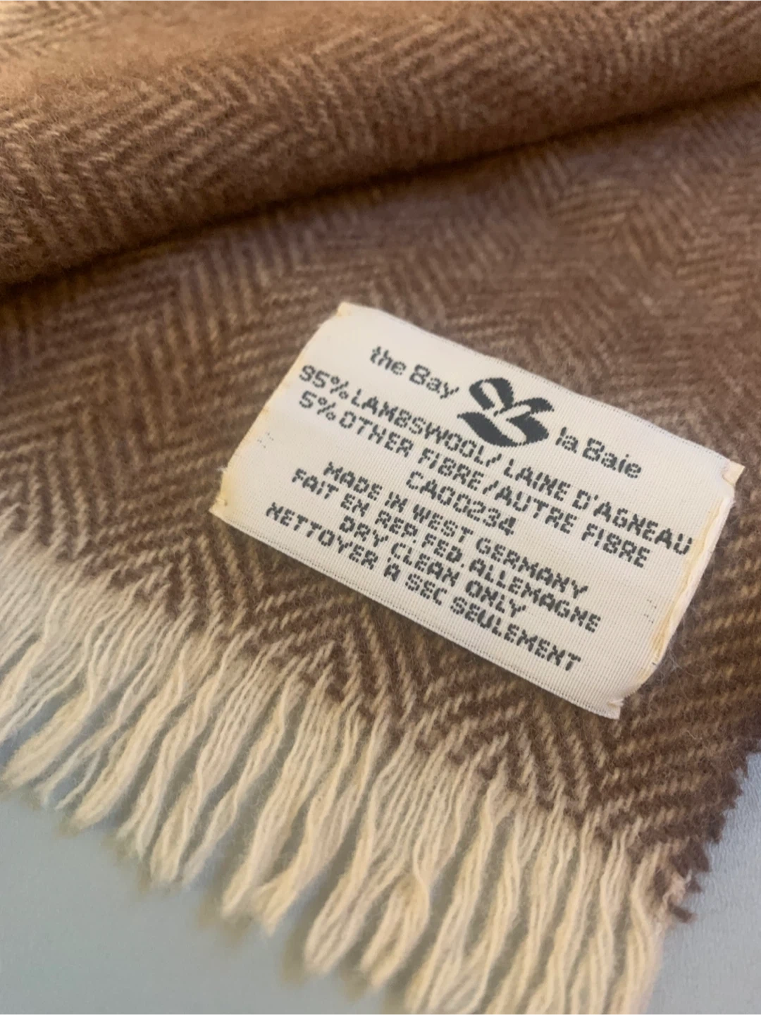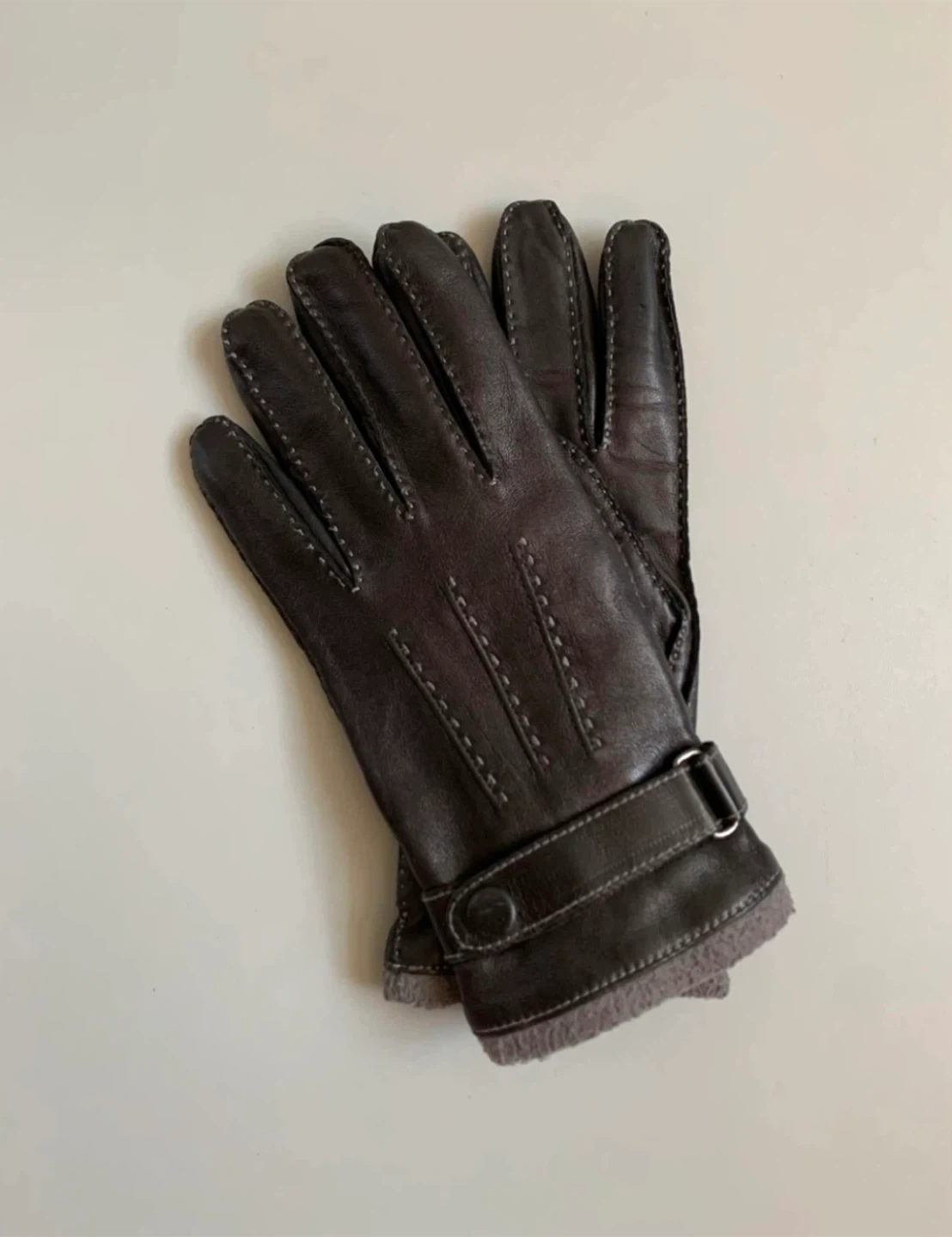 •Danier classic style smooth supple rich brown genuine leather gloves with soft fleece insulated liner and buckle detail. •Hudson’s Bay scarf in a timeless herringbone pattern- 95% lambs wool in shades of brown and cream.