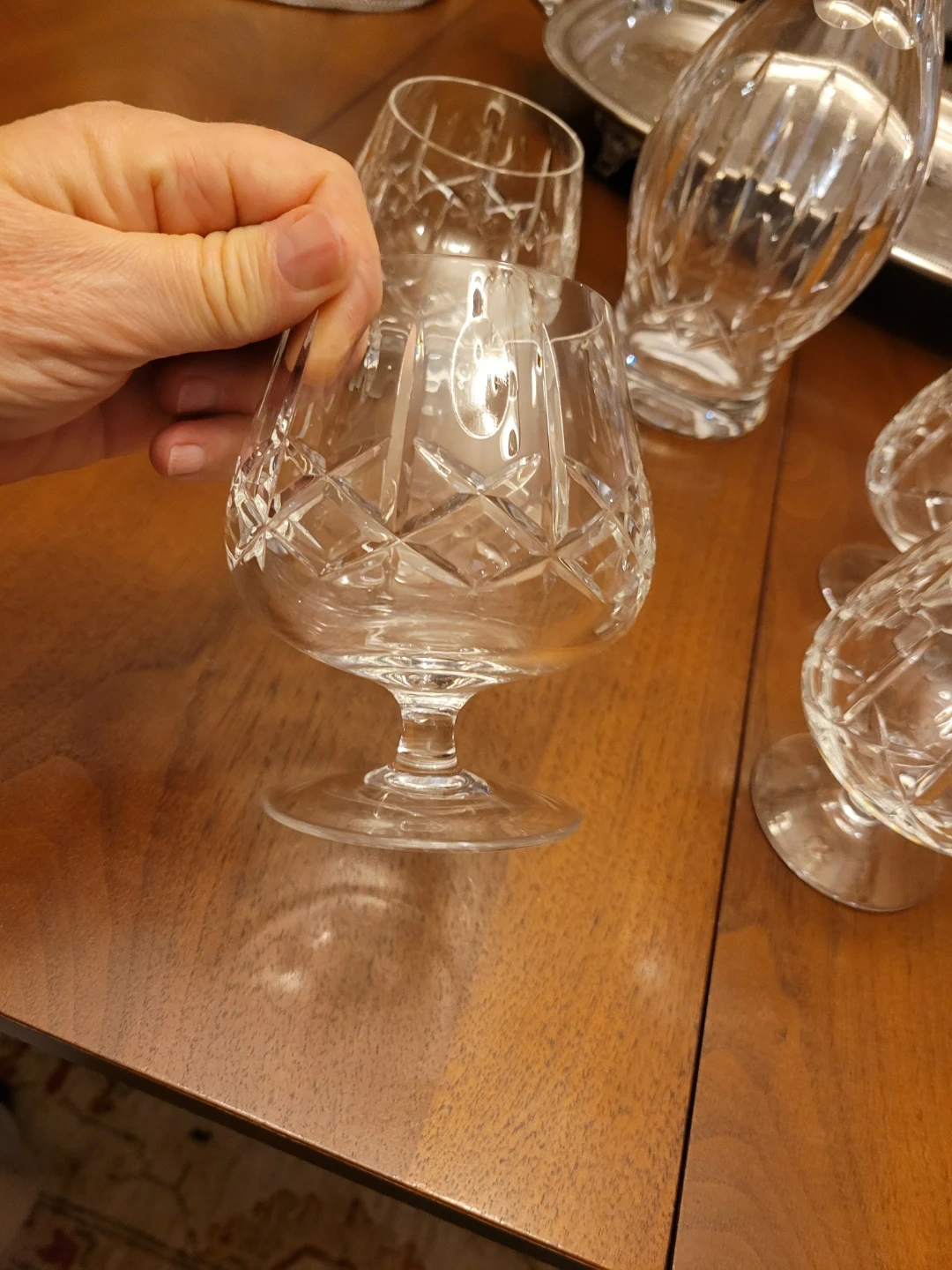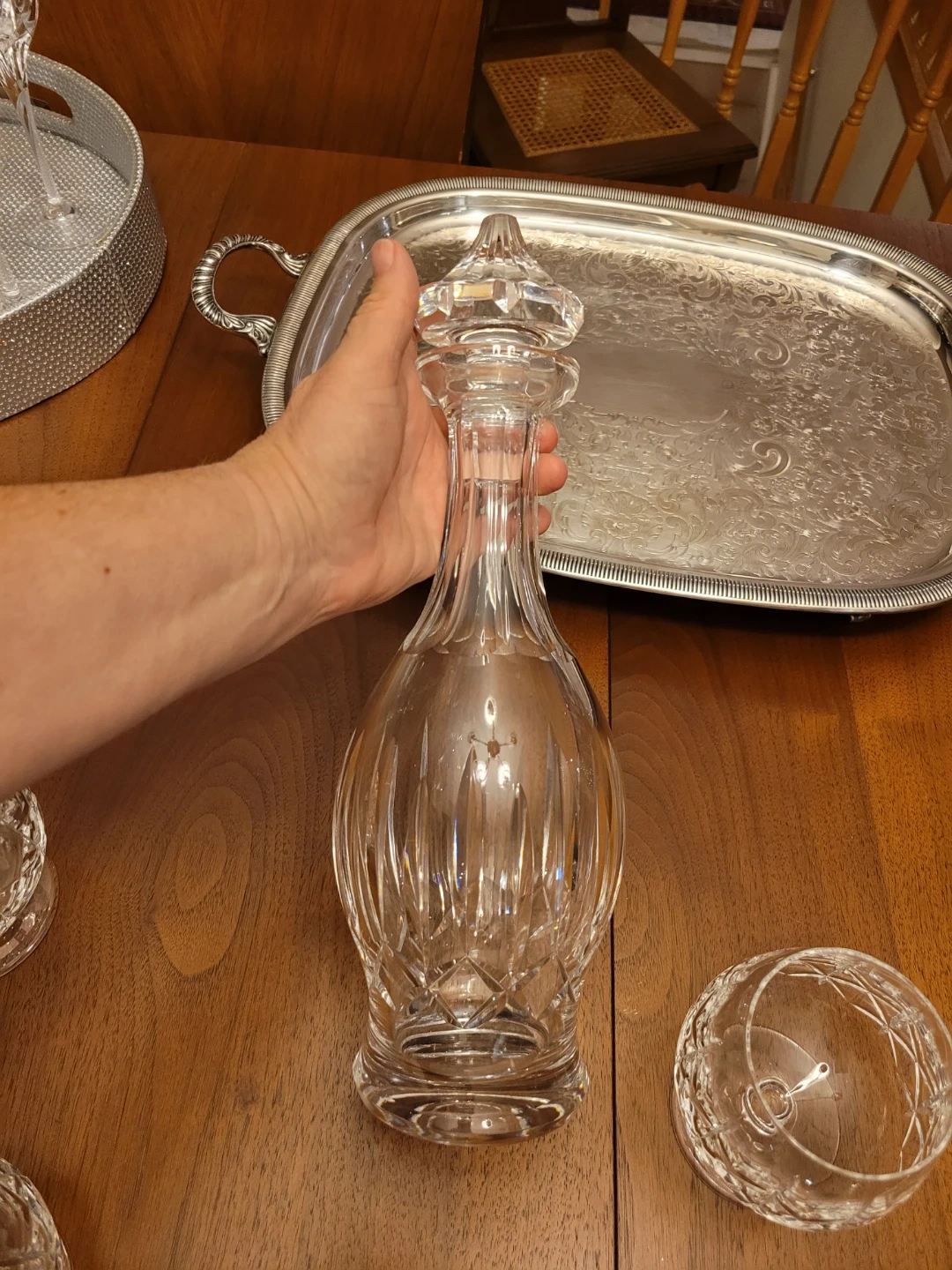 Selling a beautiful crystal decanter set, complete with glasses and a serving tray. The set features a classic design and would make a lovely addition to any home bar or dining room. The decanter has a stopper, and there are several matching glasses included. The tray is silver-plated and adds an elegant touch to the set. This is absolutely stunning, the decanter looks like Kildare pattern by Waterford, however I don't see any stamp. The glasses have and amazing ting at the slight touch, again I can't see stamp.