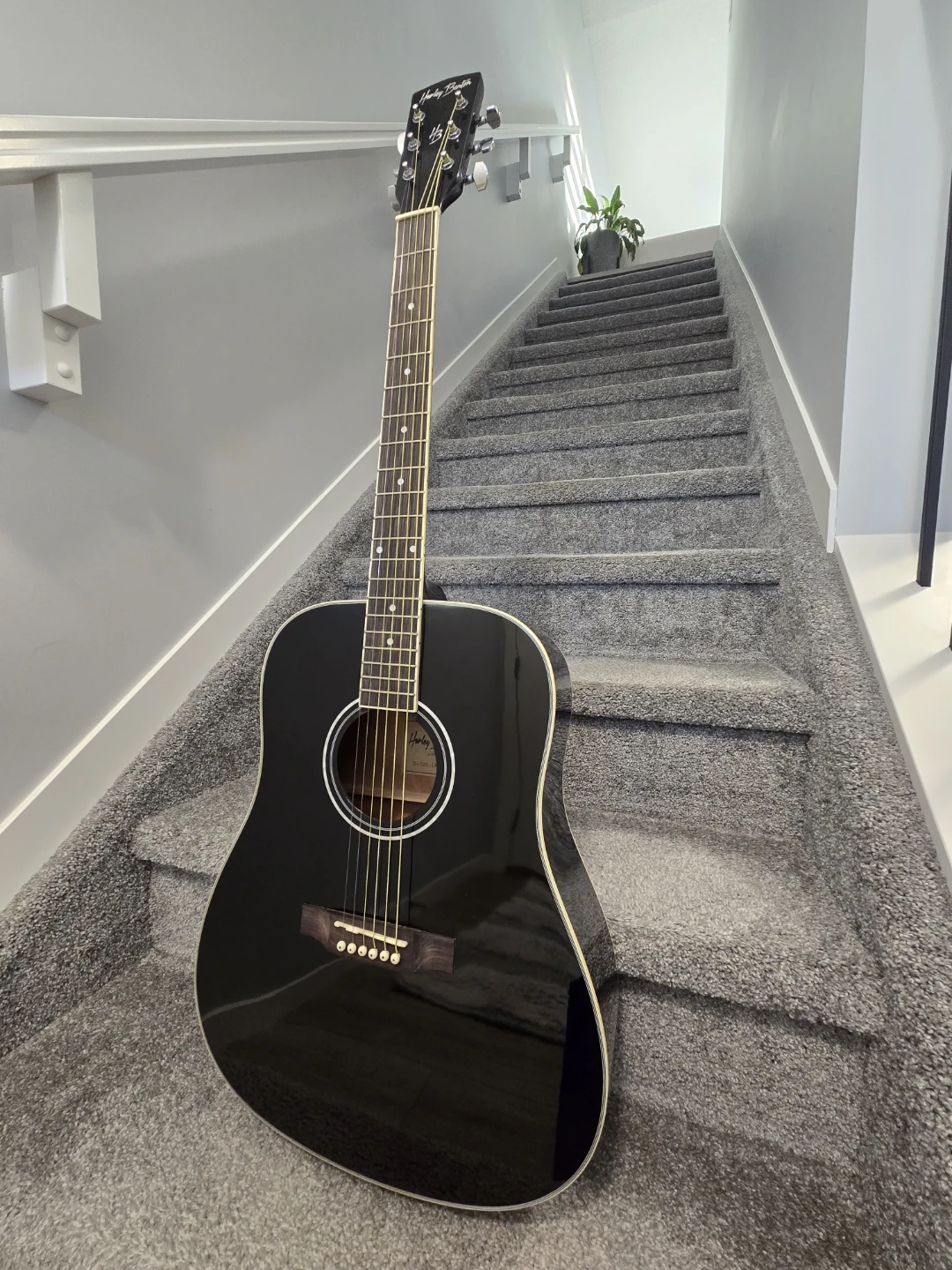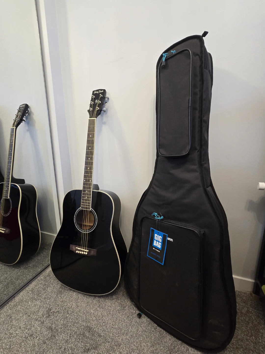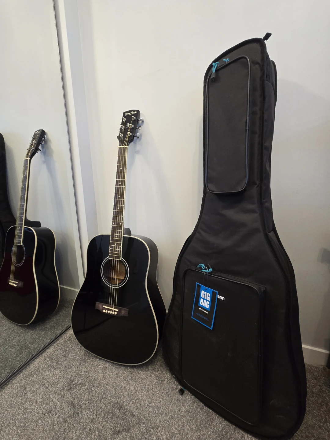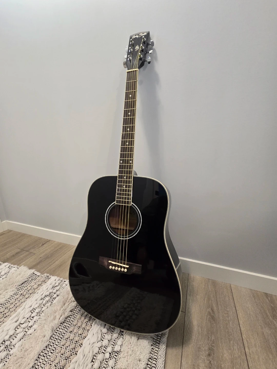 Selling a Harley Benton d120 Left handed black acoustic guitar in great shape! It comes with a black gig bag for easy transport and new set of picks. This guitar is perfect for beginners or experienced players looking for a reliable instrument. No Scratch nor defects on it.