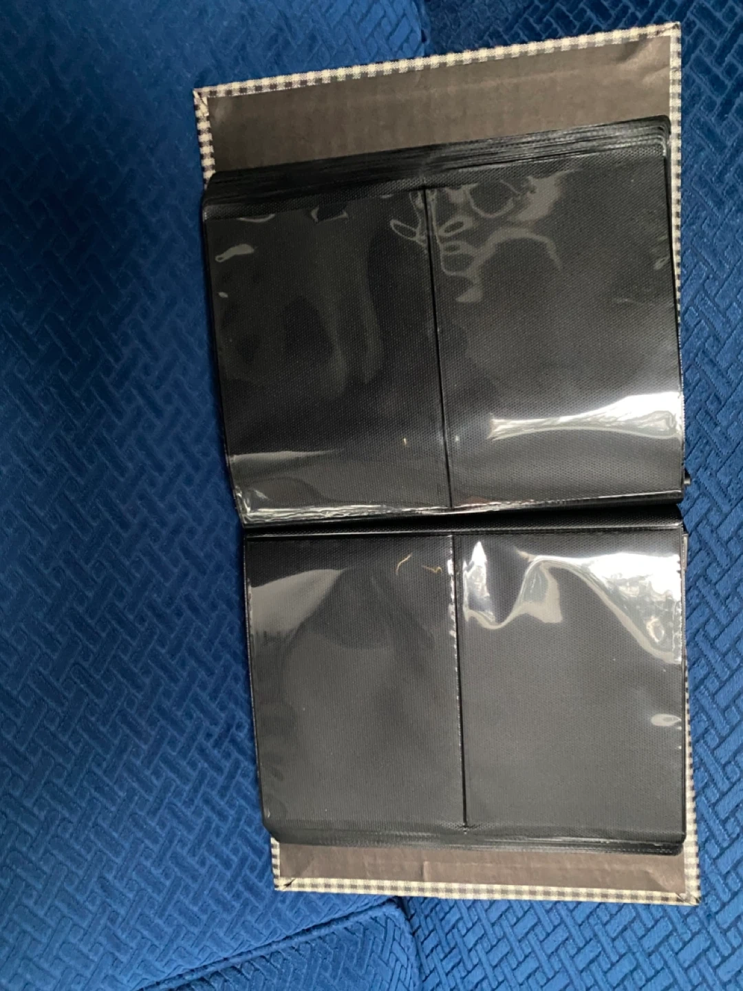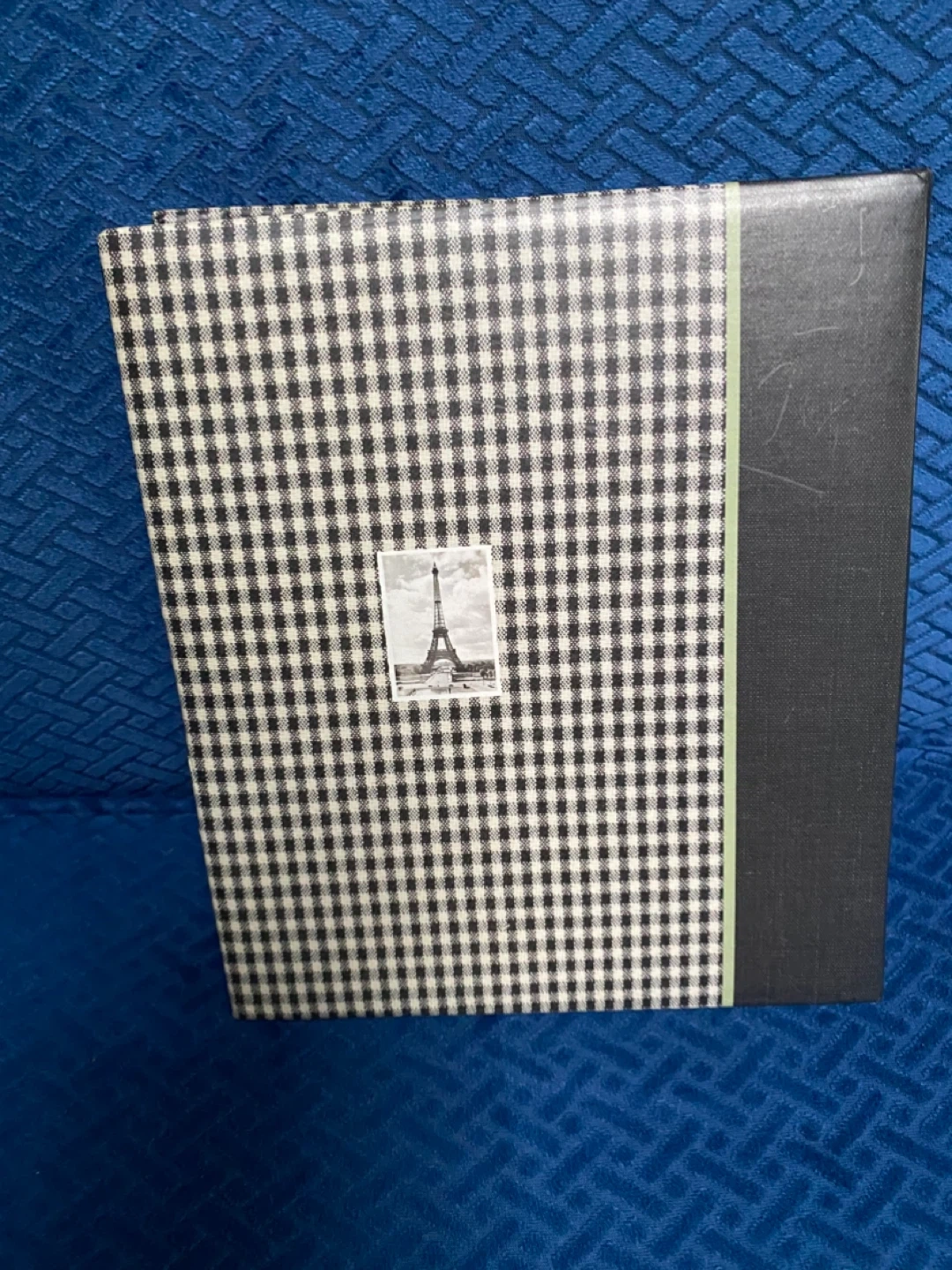 Selling a photo album with a cute Eiffel Tower design! It's in great condition and ready to hold your precious memories. The album has a black and white checkered pattern on the cover, with a black spine and a little green accent stripe.