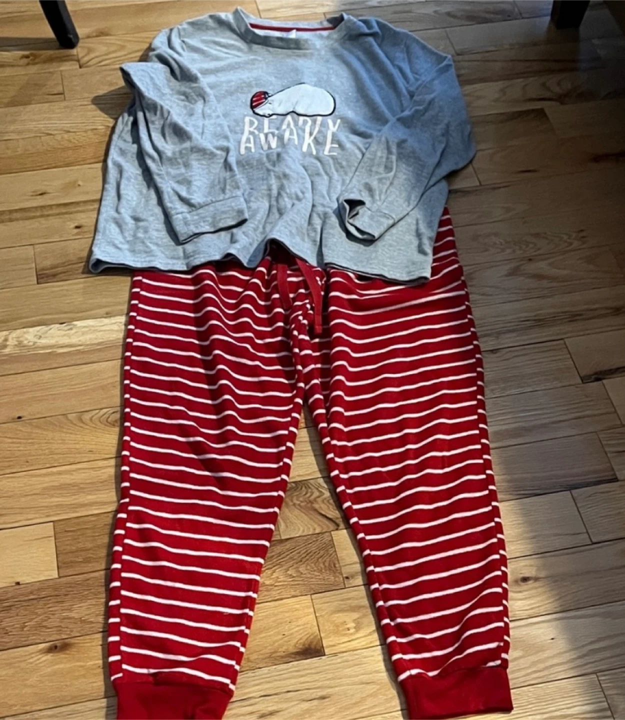 Cozy up with this adorable George pajama set! The top features a cute polar bear design with the words "Bearly Awake", while the pants have a fun red and white striped pattern.