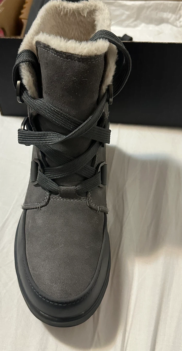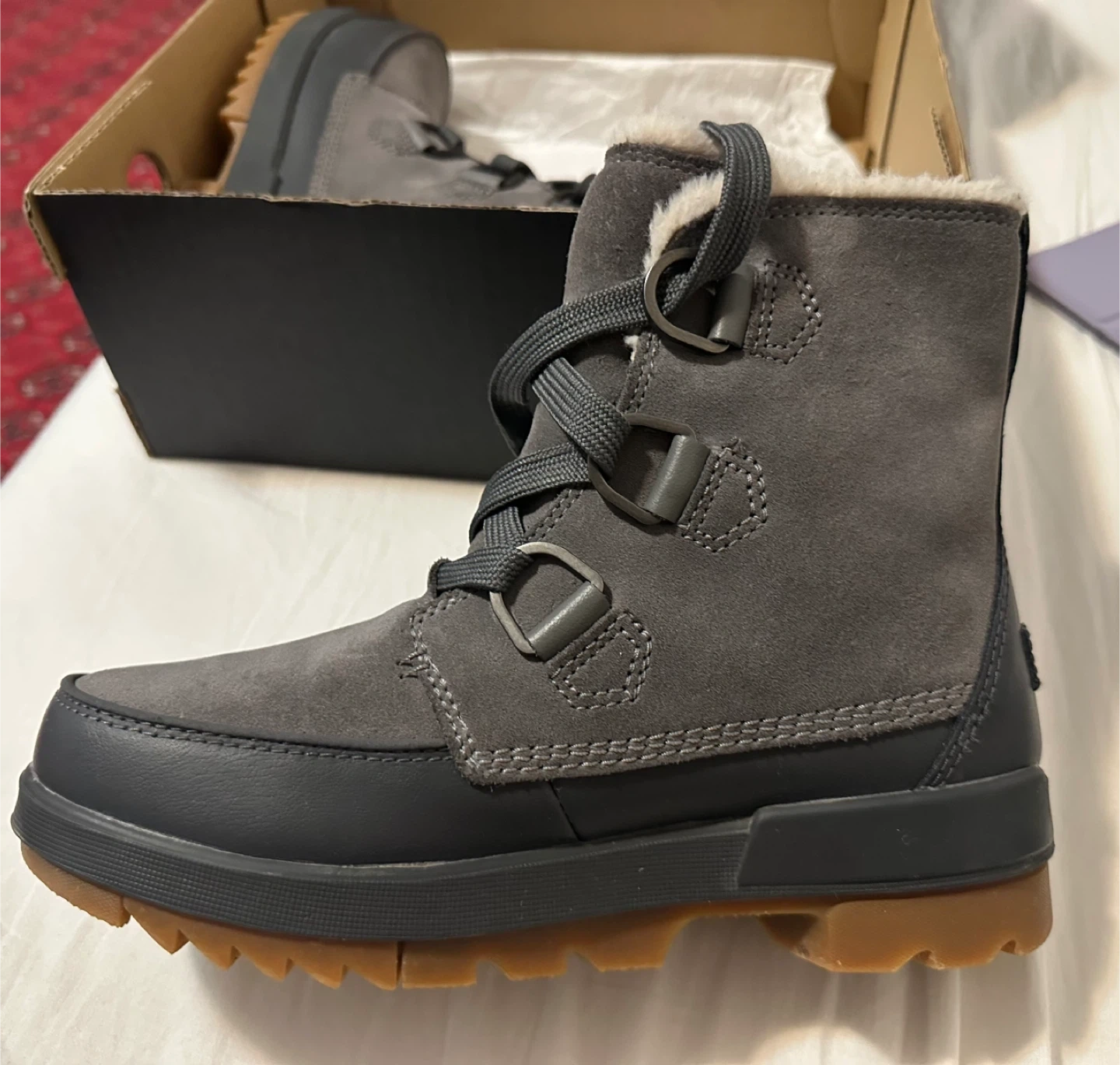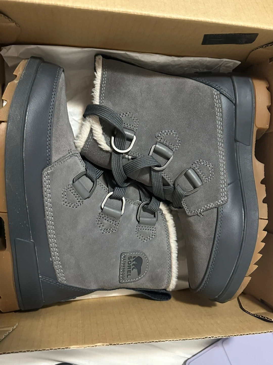 Selling a pair of Sorel Explorer Joan boots in grey, size 8. They come with the original box! These boots are perfect for keeping your feet warm and dry during the winter months. They are in great condition and ready for a new owner
