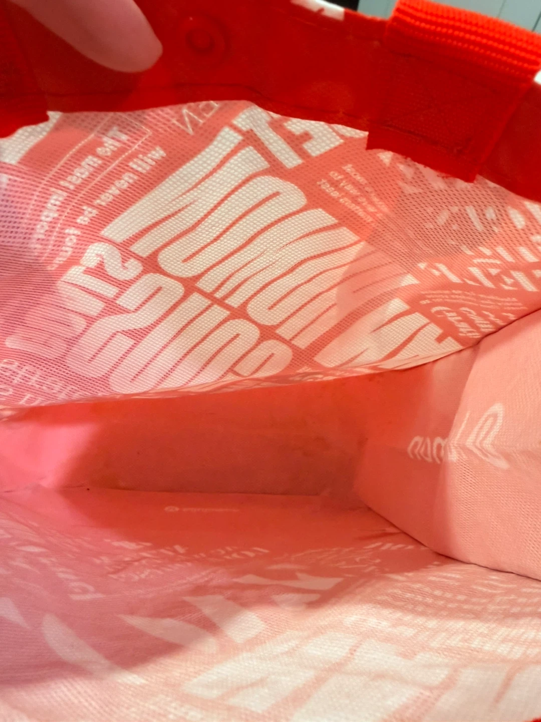 Selling a Lululemon reusable tote bag in red! It's in great condition and perfect for carrying your groceries or gym clothes. Features motivational words and phrases all over the bag. A stylish and practical accessory! New