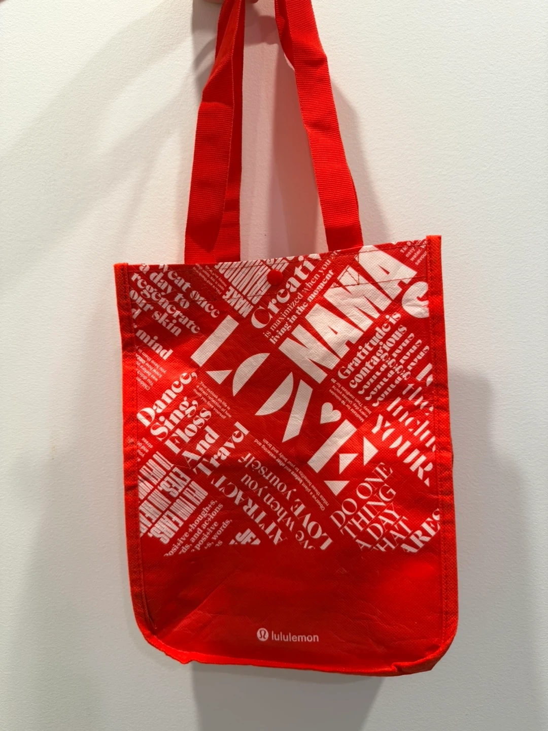 Selling a Lululemon reusable tote bag in red! It's in great condition and perfect for carrying your groceries or gym clothes. Features motivational words and phrases all over the bag. A stylish and practical accessory! New