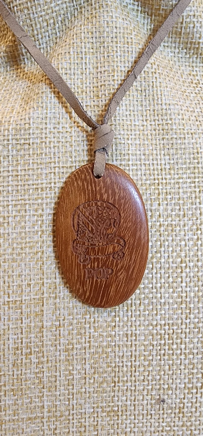 This is a unique, handmade wood pendant necklace with a distinctive design carved into the wood. The pendant has an oval shape and is strung on a light brown cord. A great accessory to add a natural touch to your style