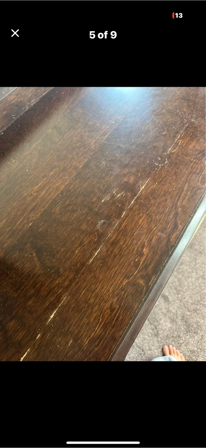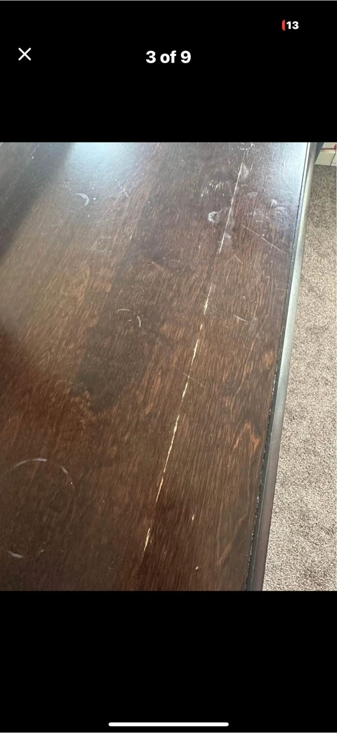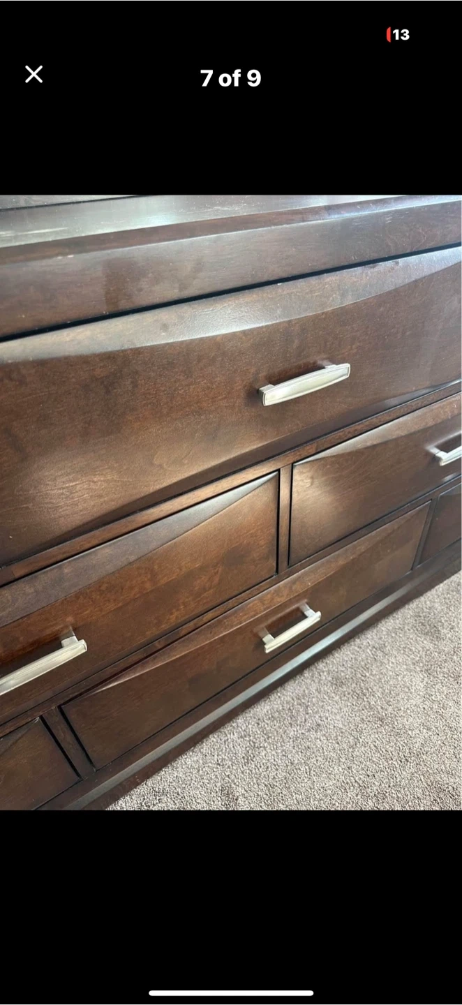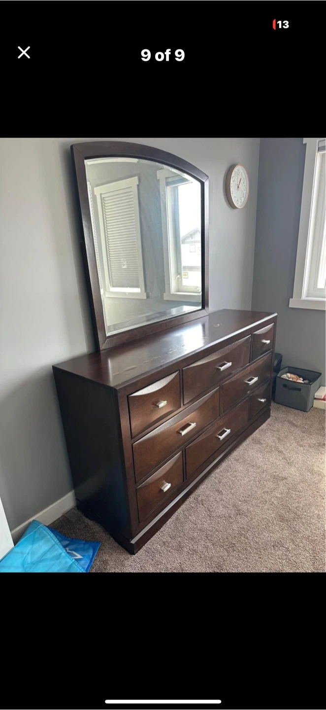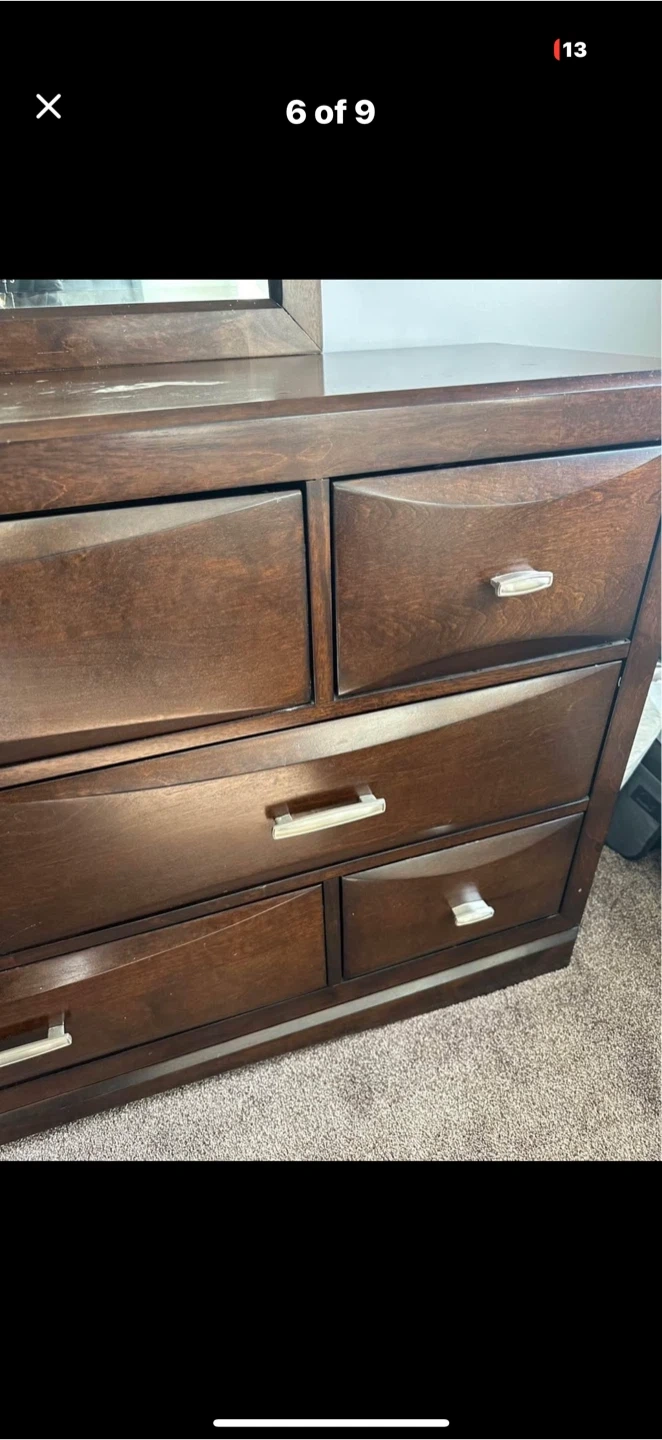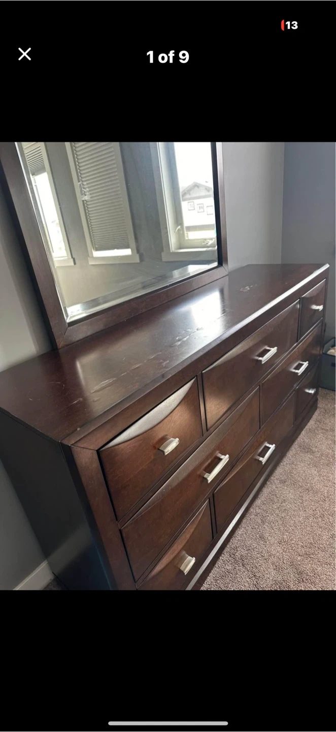 Selling a wood dresser with a mirror. It has some scratches and signs of wear on the top surface, as shown in the pictures. Still a functional and stylish piece!