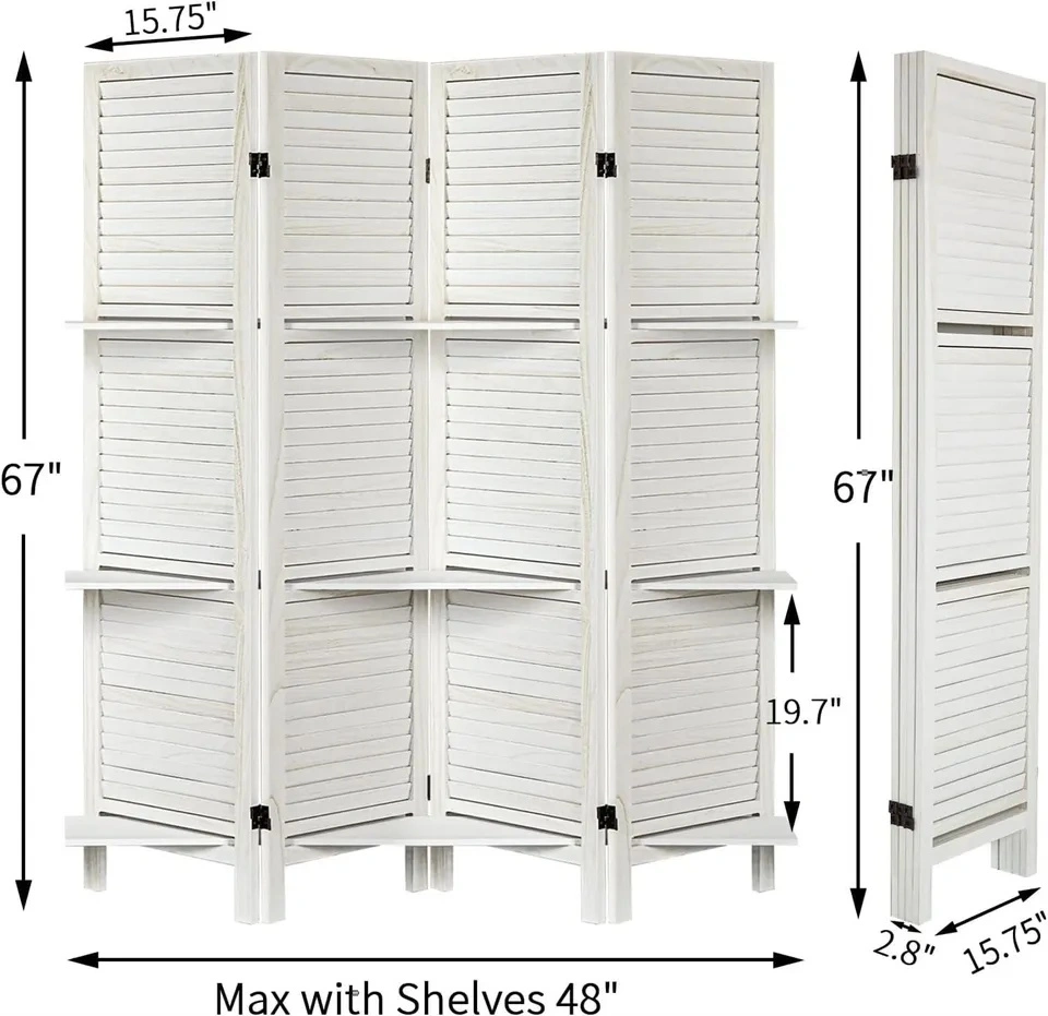 4 Panel 5.6 Ft Tall Partition Wood Room Divider, Wood Folding Room Divider Screens, Panel Divider&Room Dividers, Room Dividers and Folding Privacy Screens with Shelves(4 Panel,White)