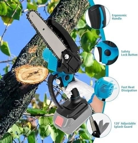 Compatible with Makita 18V series batteries, for BL1860 BL1850 BL1840 BL1830 BL1815. It has a powerful 450W pure copper brushless motor and can easily cut thick branches up to 4 inches. Lightweight and easy to use, it weighs only 0.8kg. Features include a splash guard, safety switch, and non-slip handle. It can slice through 5 inches of wood in just 10 seconds.