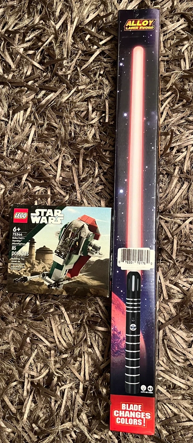 Selling an Alloy Laser Sword and a LEGO Star Wars set together! The laser sword box says it has motion sensors, controlled sounds effects, lights and sounds, and blade changes colors! The LEGO set is 75344, Boba Fett's Starfighter, and is for ages 6+ with 85 pieces