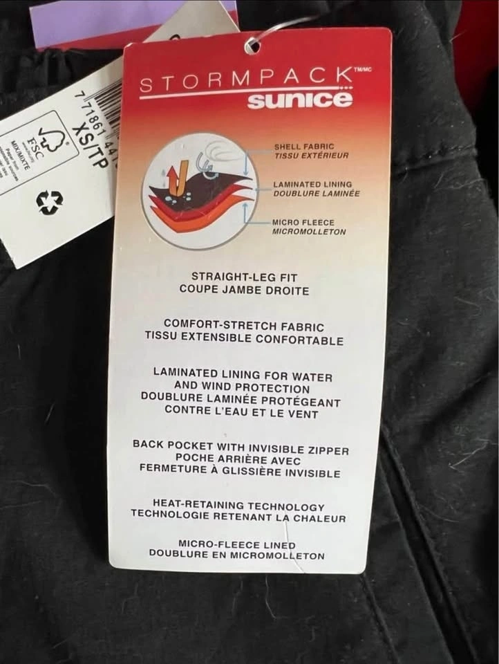 Brand new with tags. Interior fully lined with micro fleece. Two front pockets, one rear zipped pocket, straight legged bottom. One pair available, in ladies Size XS. Asking 15$. Pickup in Courtice.