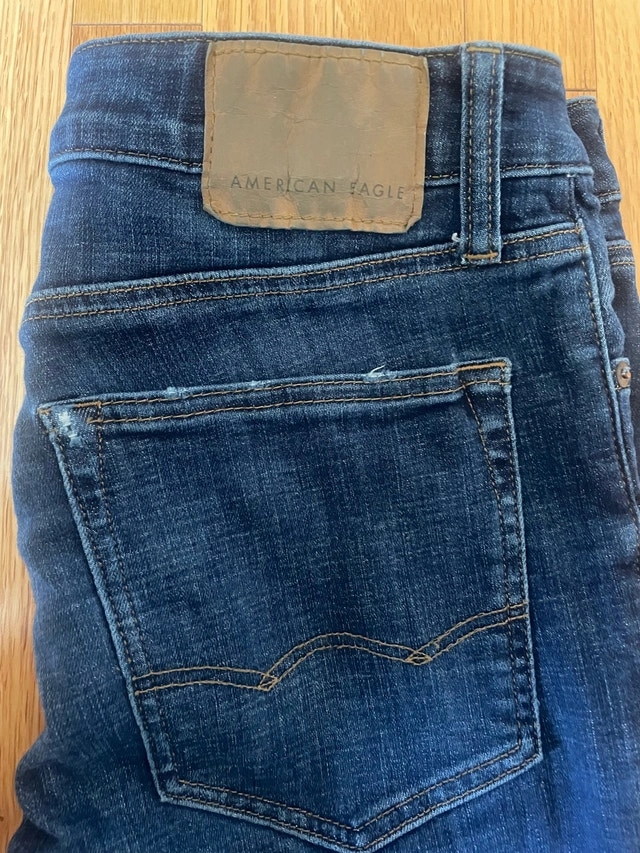 American Eagle dark wash denim jeans in size 32x34 featuring a stylishly distressed design.