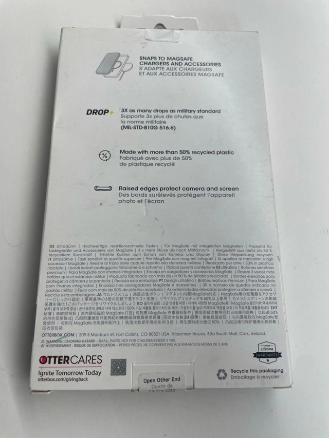 New OtterBox Symmetry Series case with MagSafe for the iPhone 15 Plus or 14 Plus, offering ultra-slim and ultra-fine protection. It is made with more than 50% recycled plastic, features raised edges to protect the camera and screen, and supports snaps to MagSafe chargers and accessories.