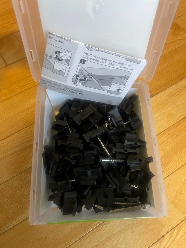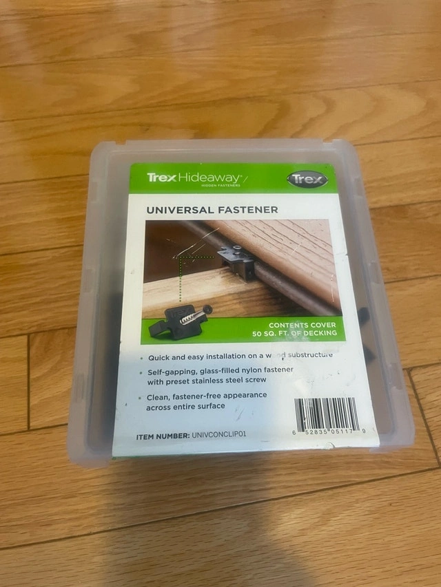 New box of Trex Hideaway Universal Fasteners, designed for easy and clean deck installation covering 50 sq. ft. These self-gapping, glass-filled nylon fasteners come with preset stainless steel screws for a fastener-free appearance across the entire surface. Key features include: * Quick and easy installation on a wood substructure * Self-gapping, glass-filled nylon fastener with preset stainless steel screw * Clean, fastener-free appearance across entire surface * Kit Contents - 50 Sq. Ft. Coverage * 90 Universal Fasteners with Preset Screws * Drive Bit * Installation Instructions. Pickup can be arranged in Brampton, Mississauga, Oakville, Burlington, Hamilton