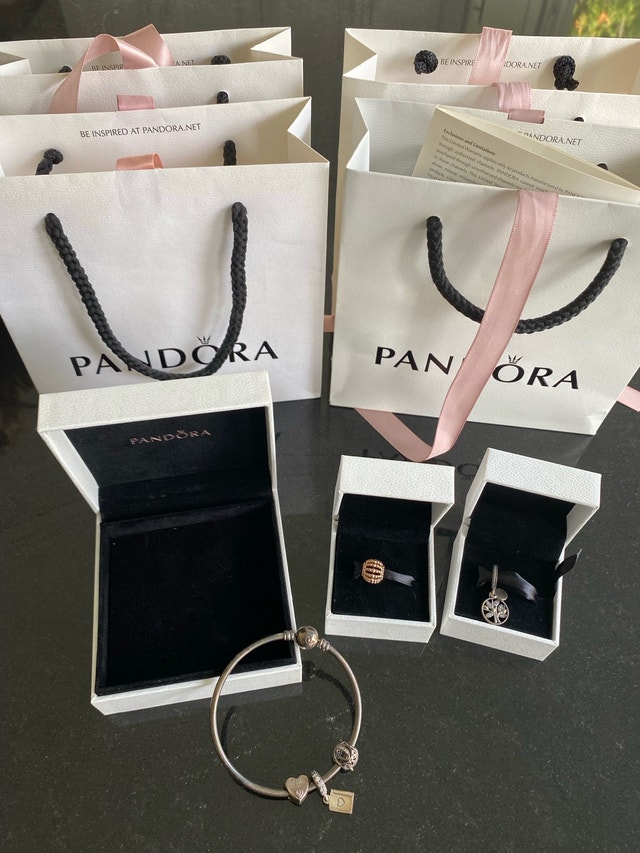 Pandora bracelet with 4 charms - including packaging as in the pictures ‘Sister’ heart charm $50 new ‘Family tree’ charm $95 new ‘Happy Birthday’ dangling charm - $65 new Rose gold bead charm - $55 new Silver bead charm - letter ‘O’ - $40 new Pandora moments bangle -$85 new Immaculate condition- hardly worn Make an offer for all - new price over $300+ tax Pickup can be arranged in Brampton, Mississauga, Oakville, Burlington, Hamilton