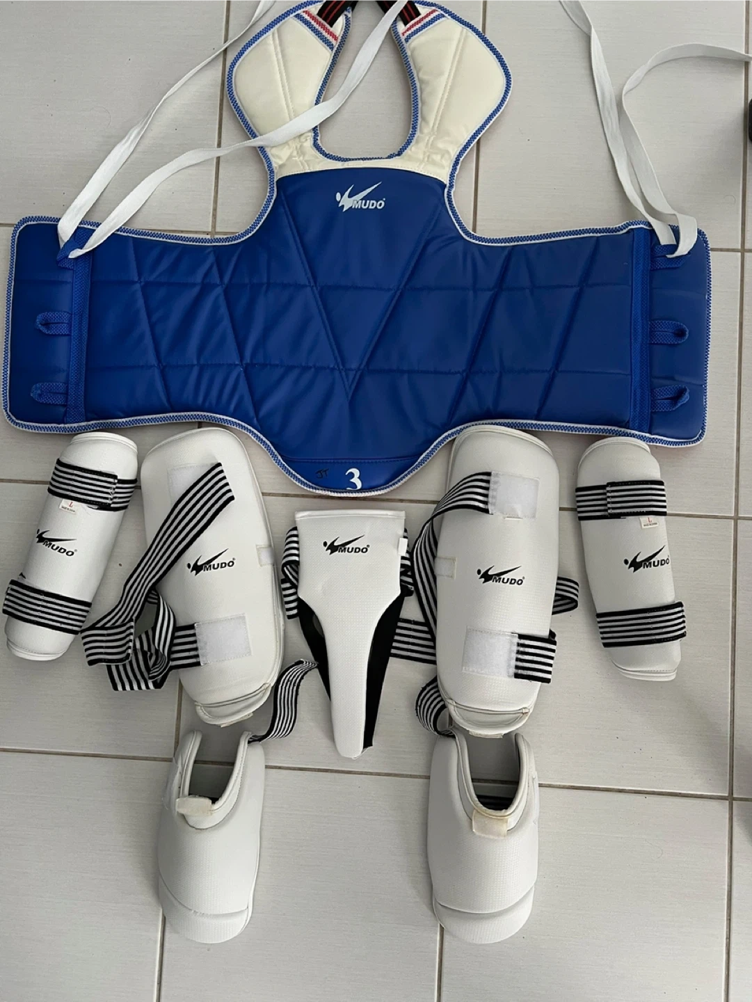 Selling a complete Mudo Taekwondo sparring gear set! This set includes everything you need for sparring, including the chest protector (size 3), arm guards, shin guards, instep protectors, and a groin protector. The gear is in good condition and ready for use. Perfect for anyone training in Taekwondo!