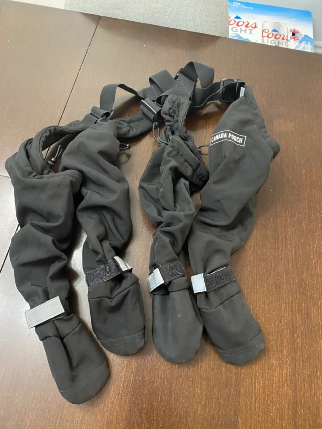 Keep your furry friend protected with these Canada Pooch Suspenders Dog Boots! These boots stay on and provide full leg coverage, protecting from snowballs, salt, and mud. They're also water-resistant and make it easy for your dog to walk in any weather. The size is 4.