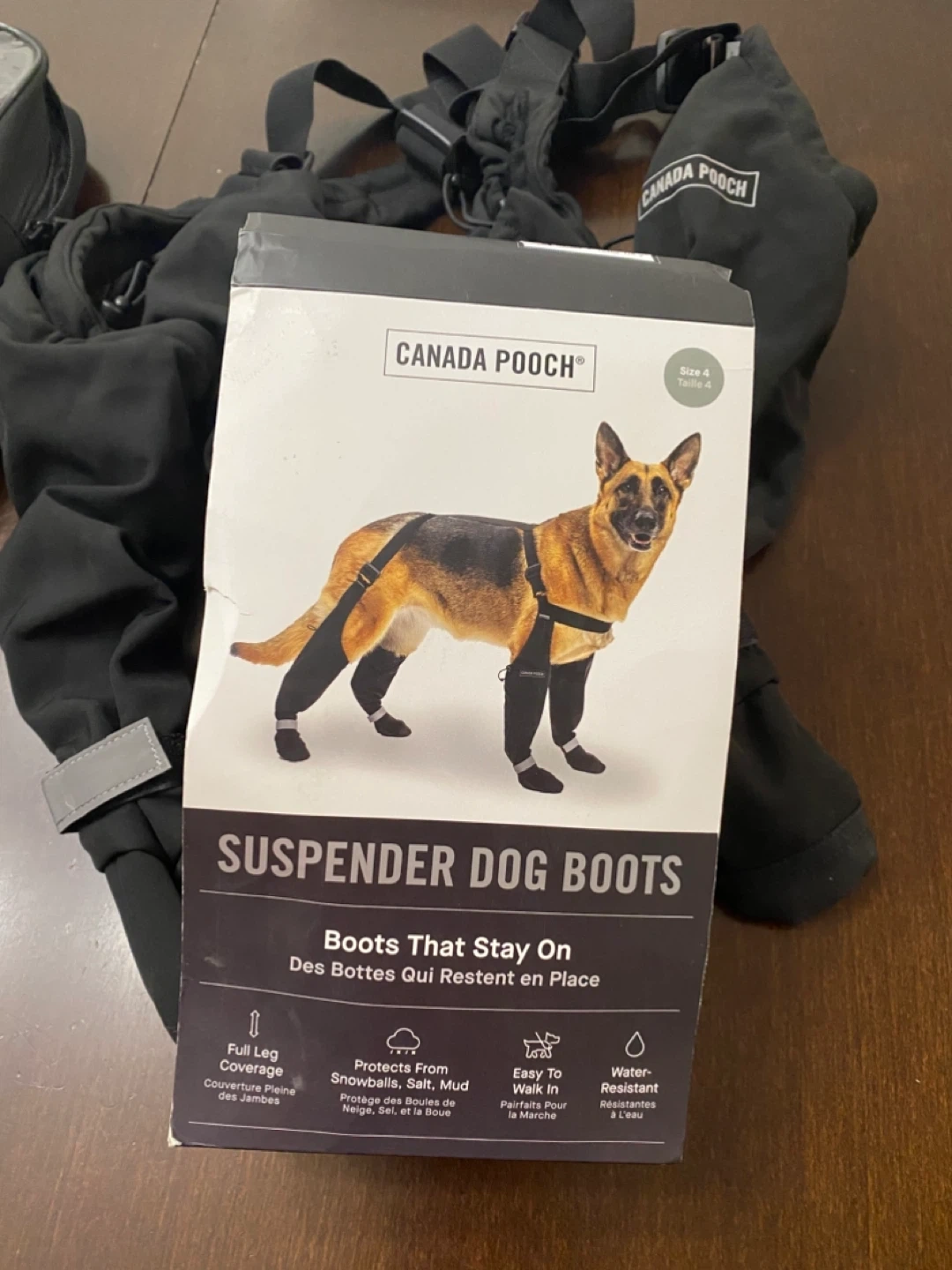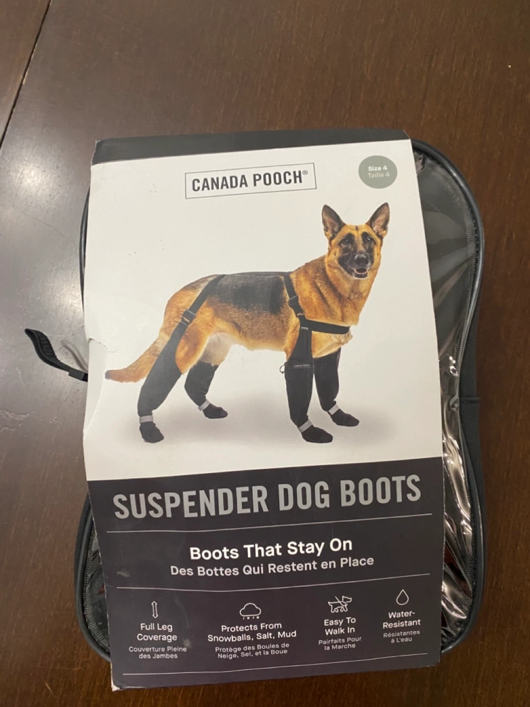 Keep your furry friend protected with these Canada Pooch Suspenders Dog Boots! These boots stay on and provide full leg coverage, protecting from snowballs, salt, and mud. They're also water-resistant and make it easy for your dog to walk in any weather. The size is 4.