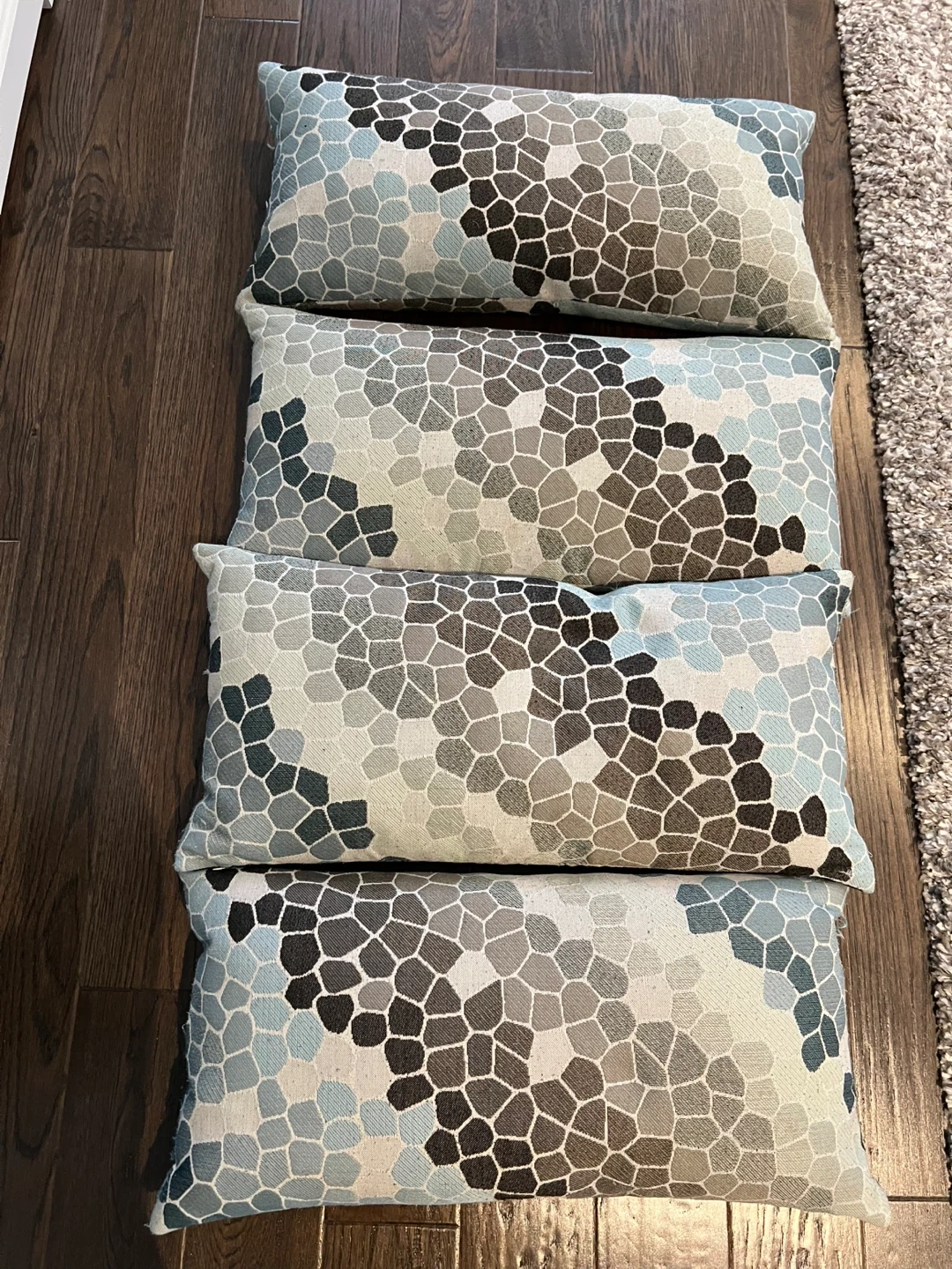I'm selling a set of 4 decorative throw pillows. They feature a unique geometric pattern in shades of blue, grey, and black. These pillows are in great condition and would be a stylish addition to any living space