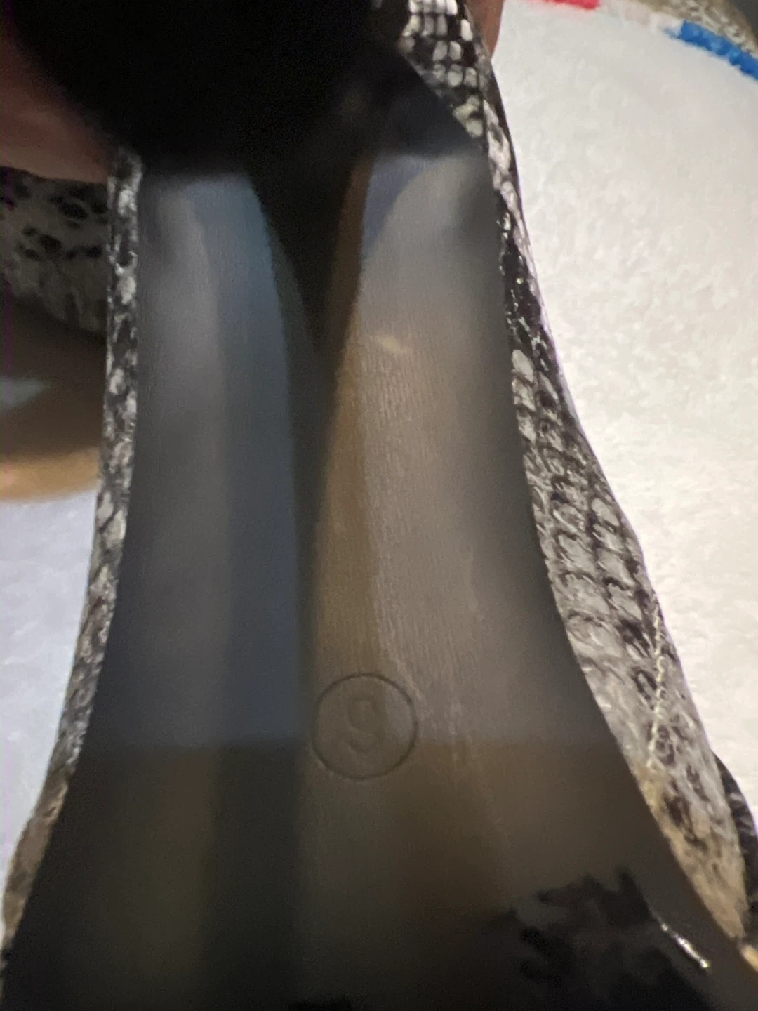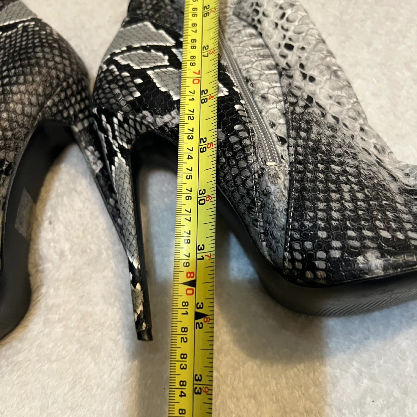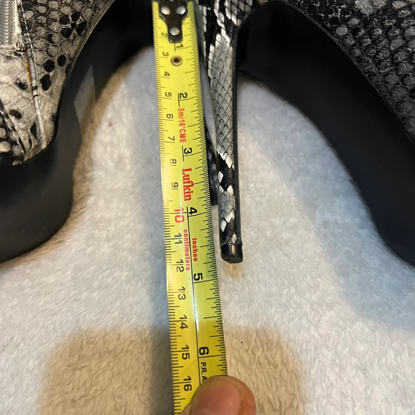 Selling a pair of snakeskin print over-the-knee boots in a size 9. The heel height is approximately 3 inches, and the overall height from heel to top is about 33 inches. These boots are sure to make a statement!